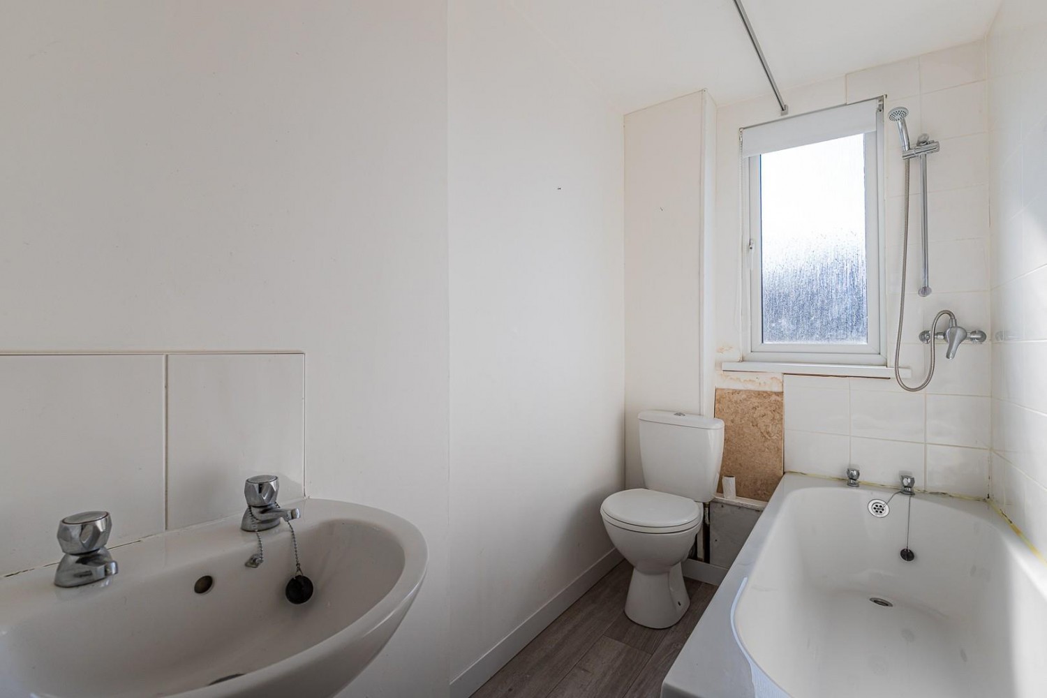 With a modern white suite comprising a panel bath with shower over, pedestal wash hand basin and close coupled wc, tiled surround, window to side.