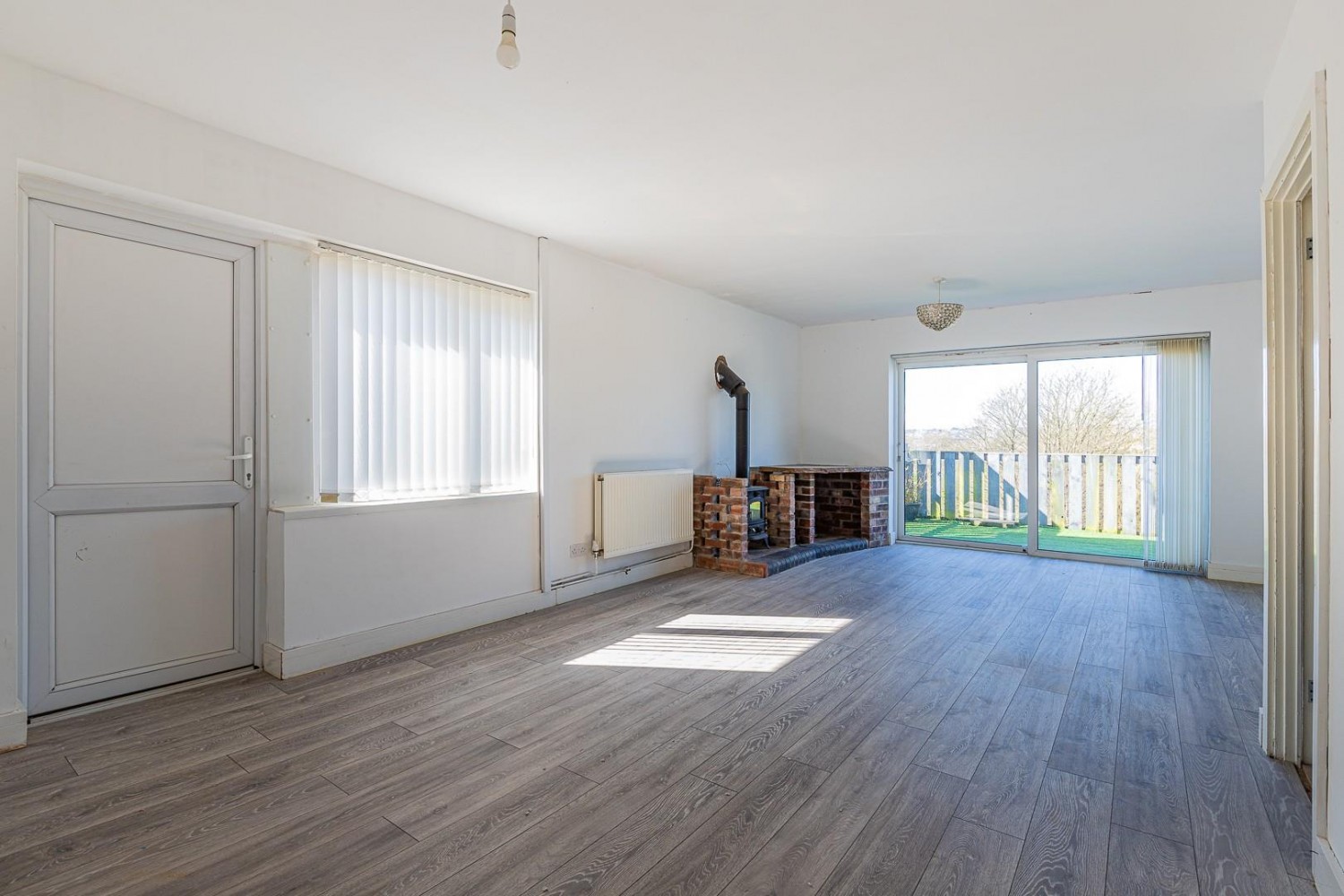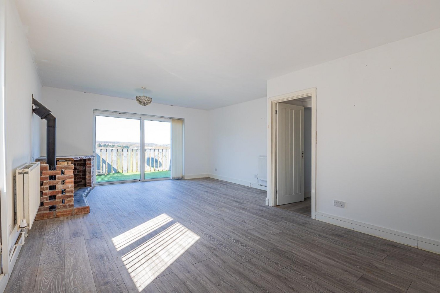 Impressively spacious living room, laminate flooring, to one corner a cast iron log burner with brick surround, TV point, window to side, sliding patio doors open out onto a steel & glass fronted balcony - 14' x 9' overlooking the rear garden and adjacent countryside.