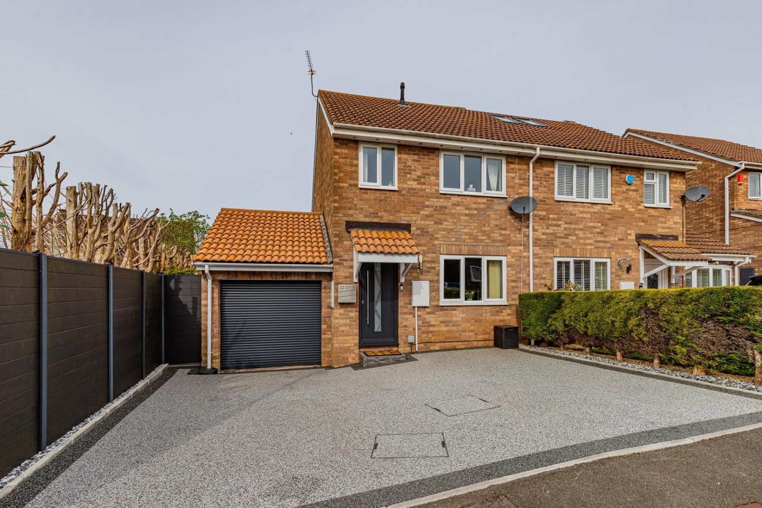 Open frontage - resin coated allowing triple off road parking and leading to the garage, composite fencing with gate leading into the rear garden.