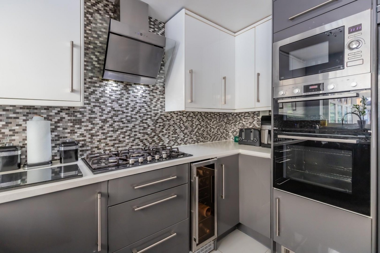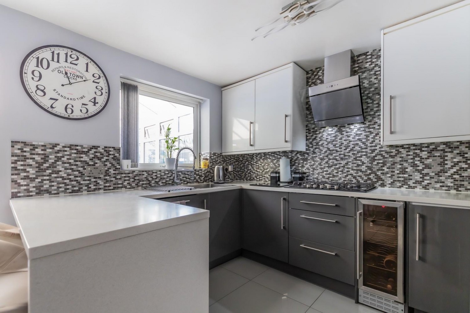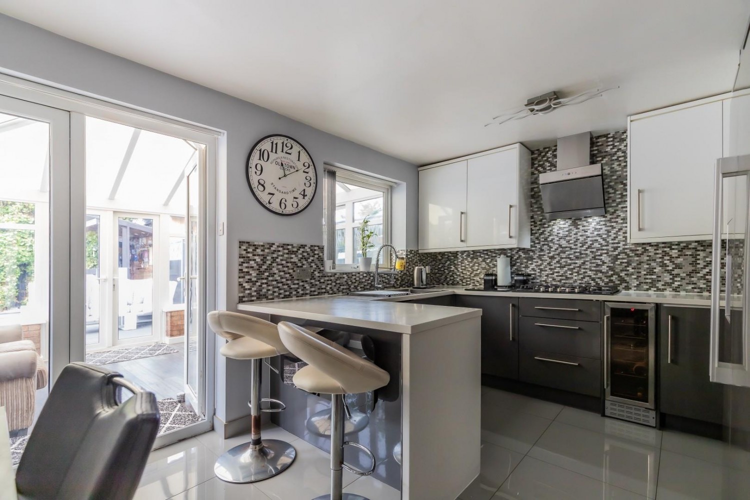 Stunningly refitted with an extensive range of wall and base units with Earth Stone Nordic white solid worktops and inset stainless steel sink & drainer with mixer tap, attached peninsular island with breakfast bar, integrated appliances include dishwasher, washing machine plus built in wine chiller and built in double oven, 5 ring gas hob & hood with built in microwave oven, porcelain tiled floor, window to rear with French doors into the conservatory, under stairs cupboard.