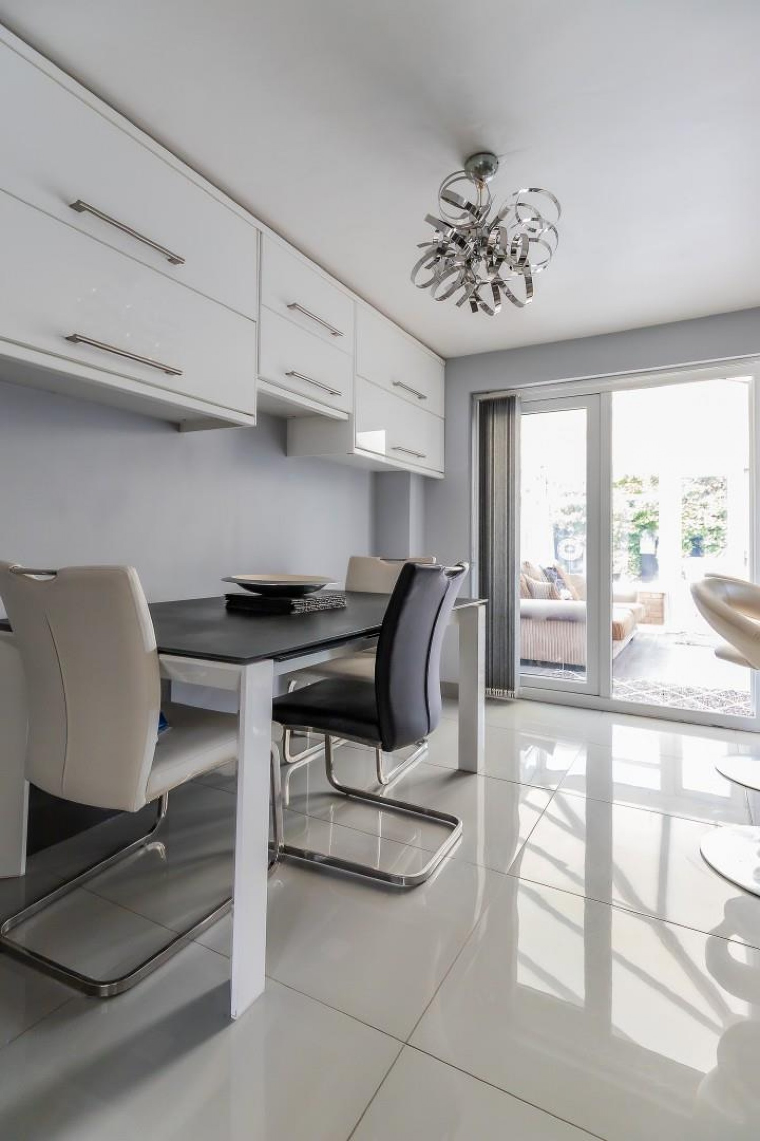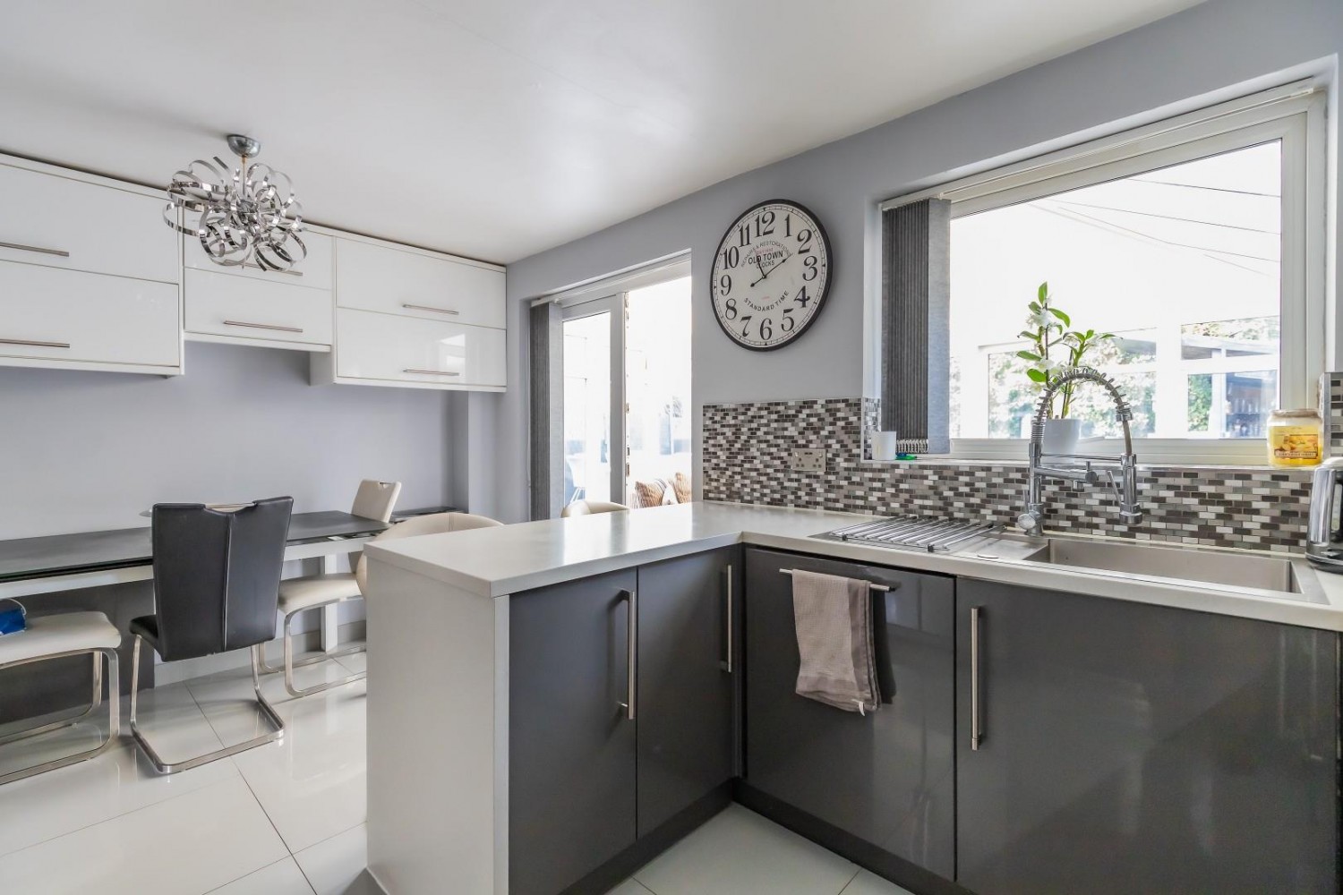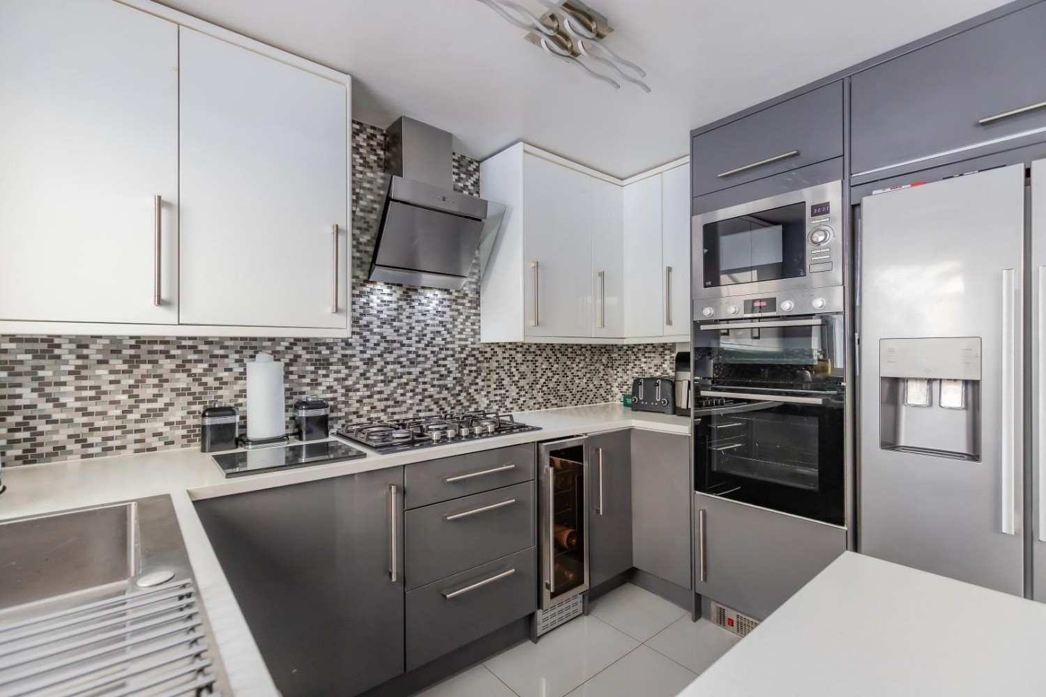 Stunningly refitted with an extensive range of wall and base units with Earth Stone Nordic white solid worktops and inset stainless steel sink & drainer with mixer tap, attached peninsular island with breakfast bar, integrated appliances include dishwasher, washing machine plus built in wine chiller and built in double oven, 5 ring gas hob & hood with built in microwave oven, porcelain tiled floor, window to rear with French doors into the conservatory, under stairs cupboard.
