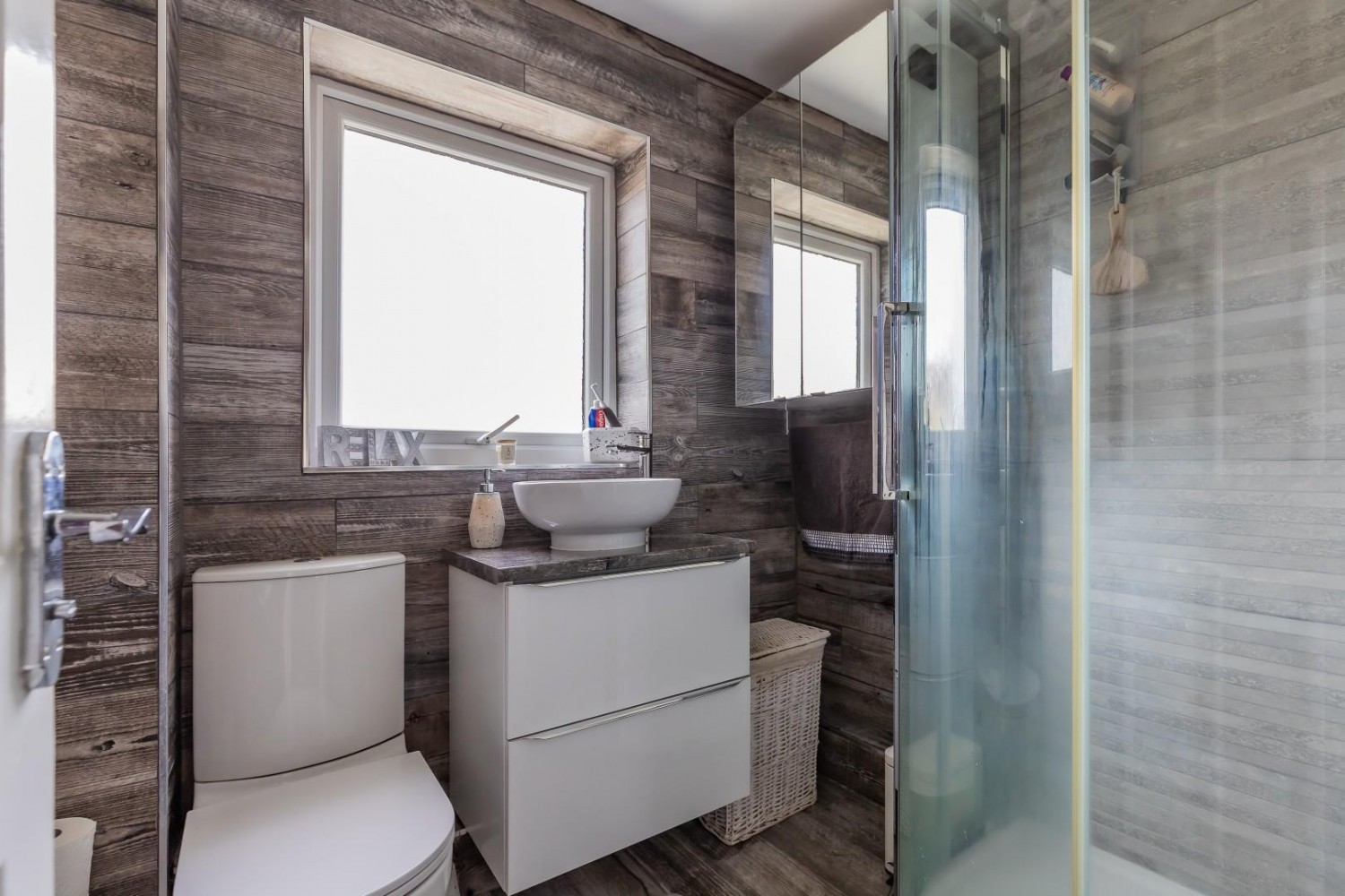 Stylishly appointed modern white suite comprising a corner 900 cubicle, floating vanity wash hand basin - 2 drawers plus round china bowl and close coupled wc, fully tiled and floor, window to rear, heated chrome towel rail, extractor fan.