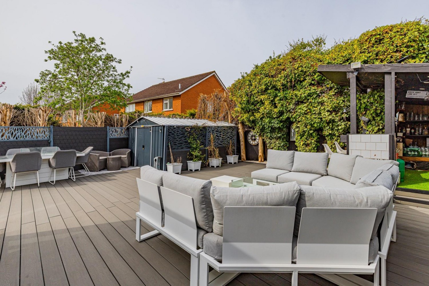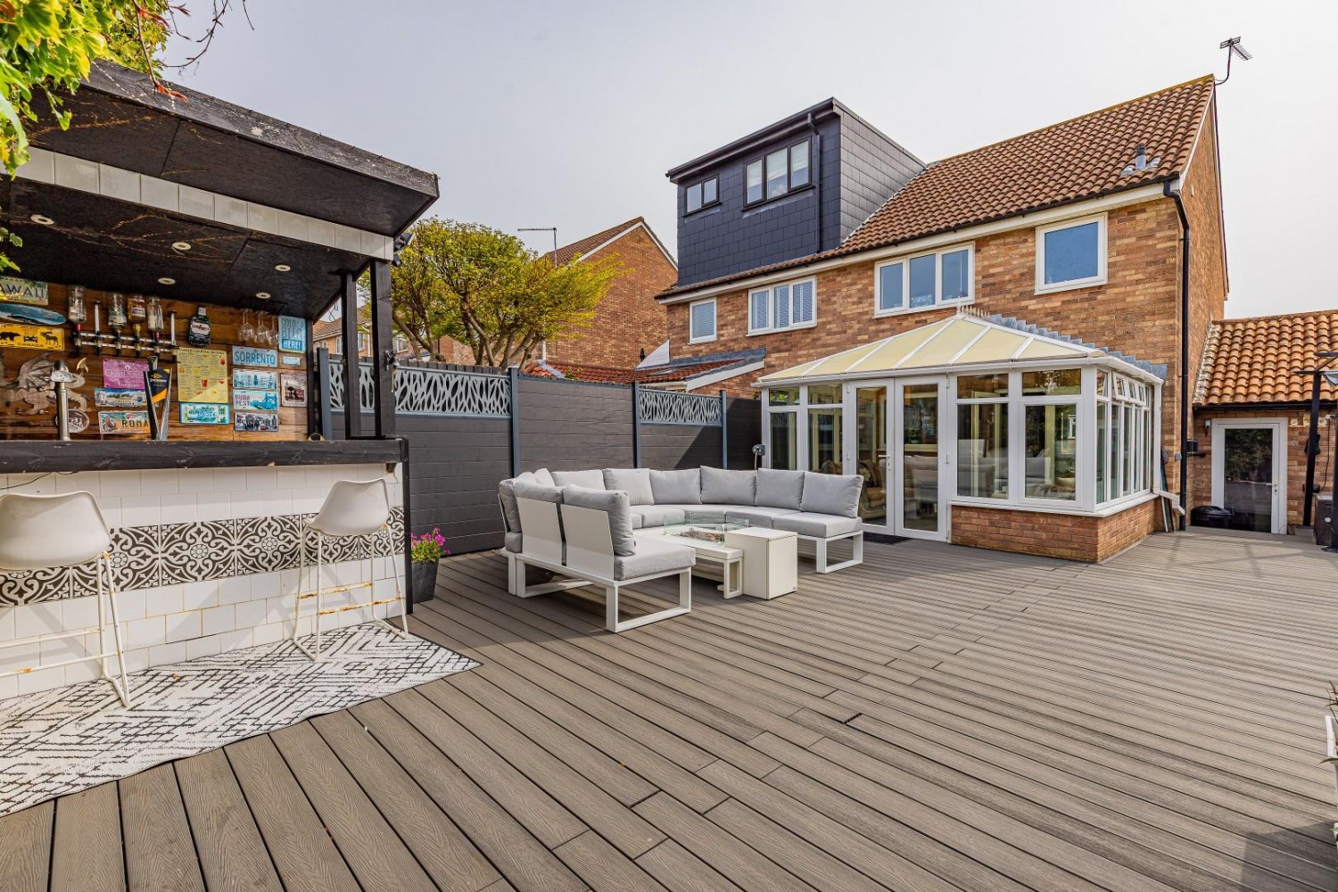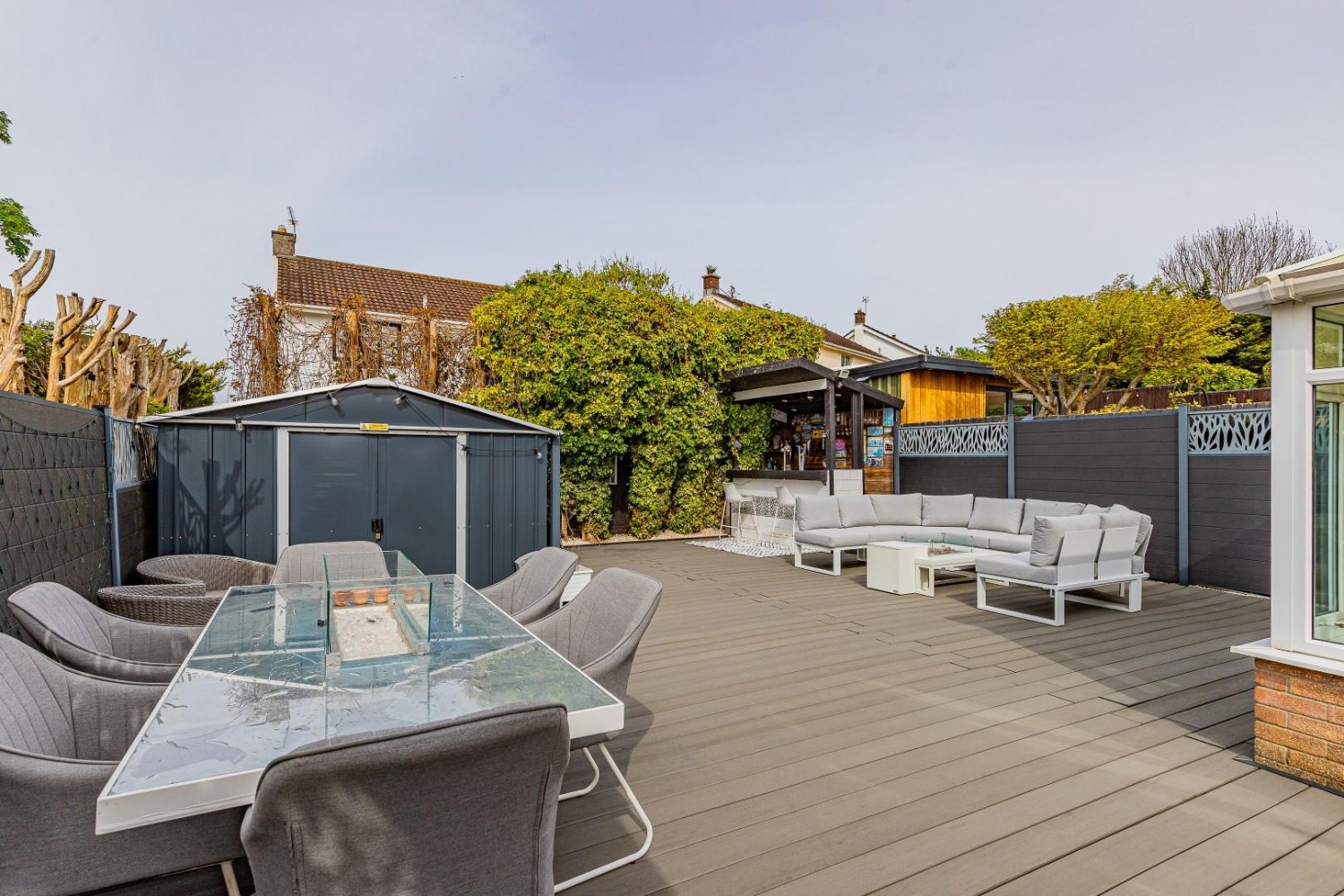 Impressive rear garden - Westerly facing, composite decking throughout, composite fencing with large 12' x 9' galvanised garden shed, outside tap, exterior lighting, to one corner an outdoor bar with electricity.