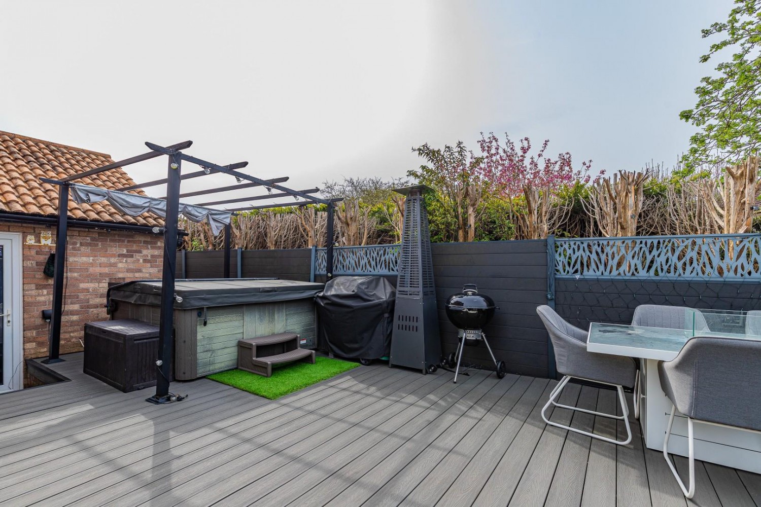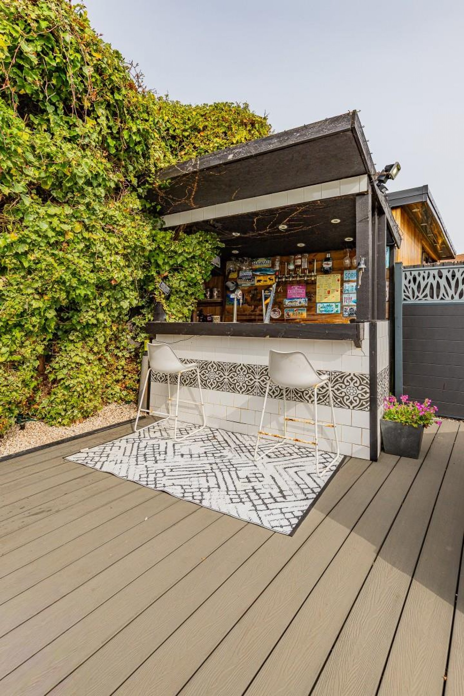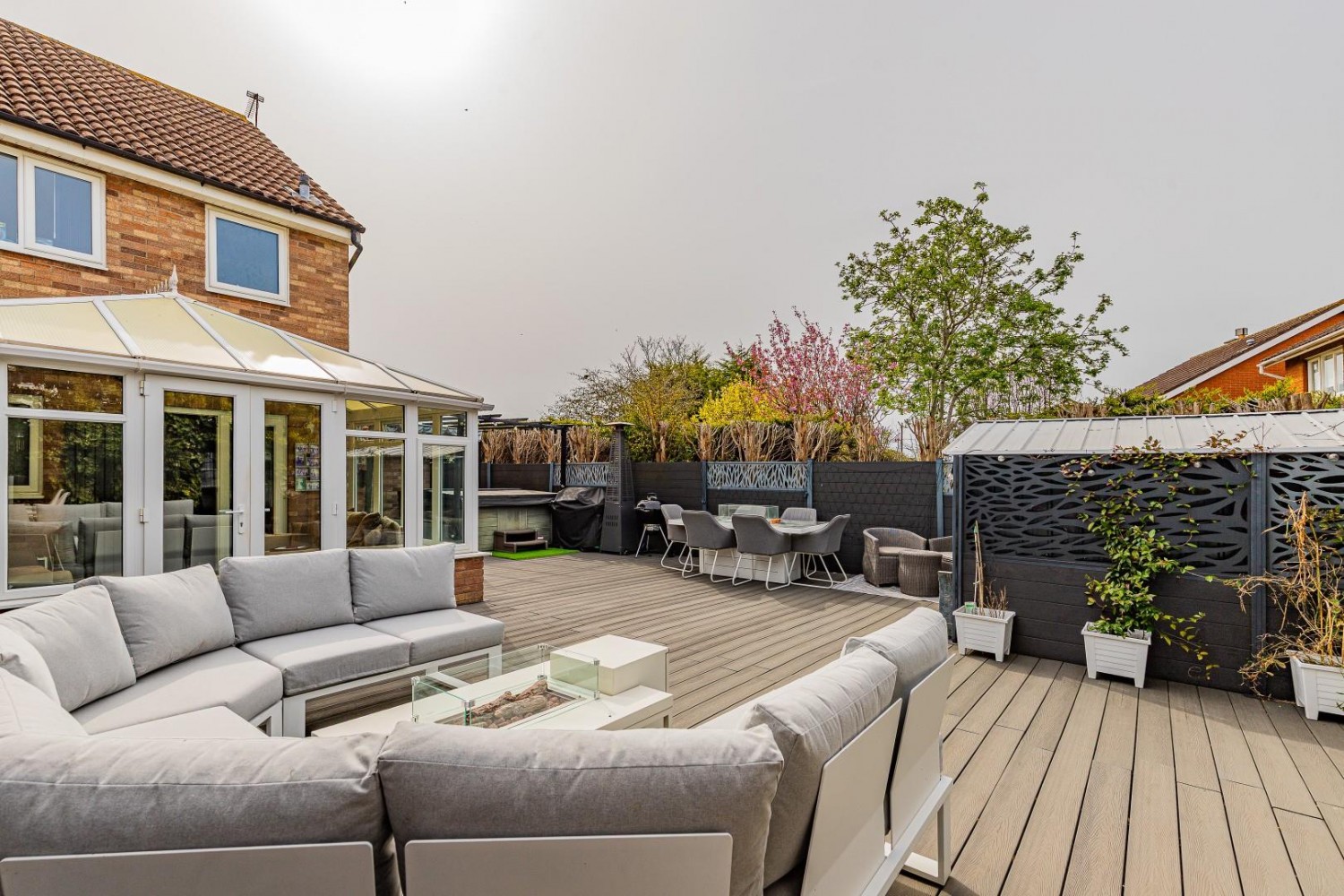 Impressive rear garden - Westerly facing, composite decking throughout, composite fencing with large 12' x 9' galvanised garden shed, outside tap, exterior lighting, to one corner an outdoor bar with electricity.
