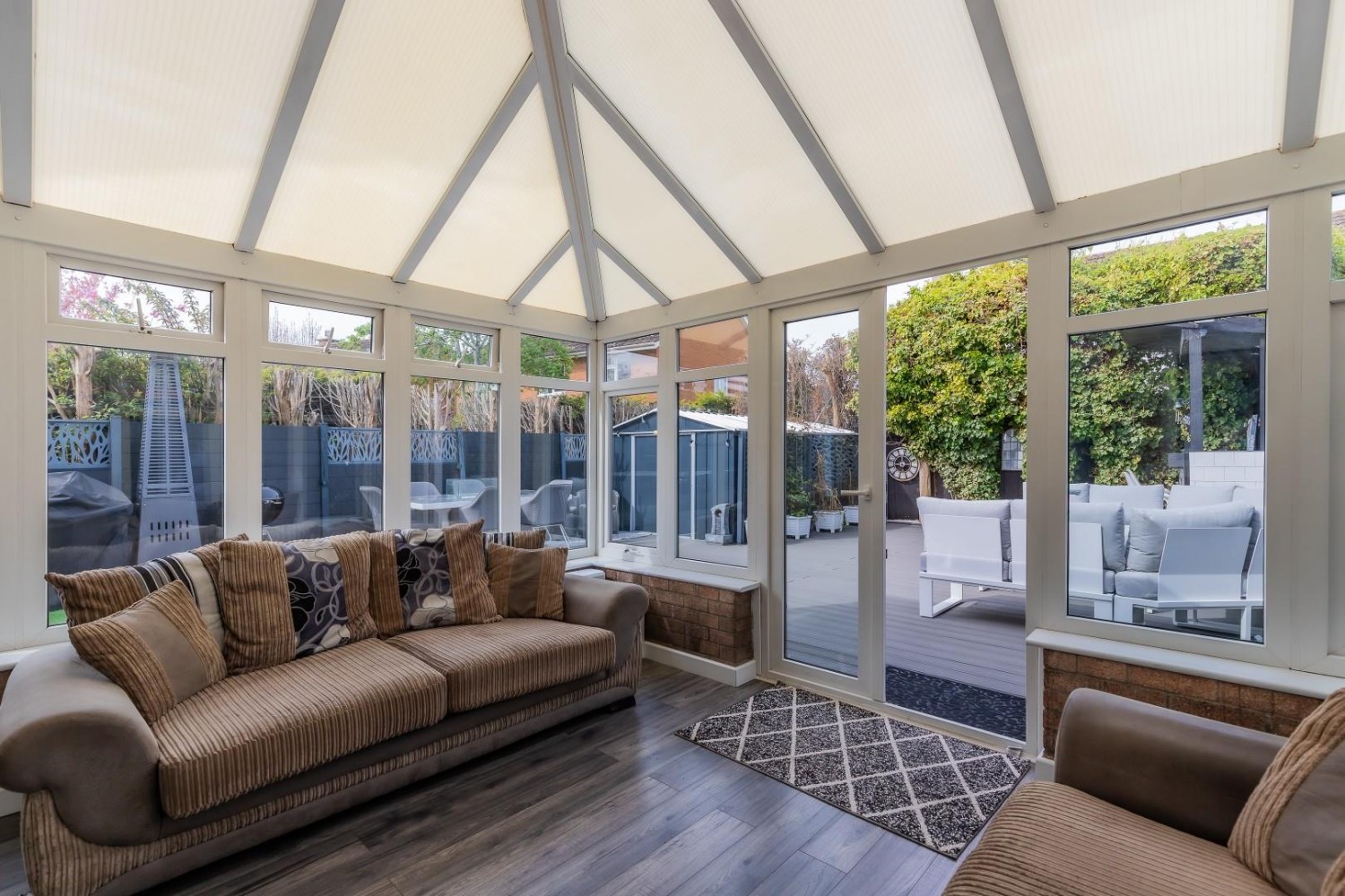 Brick based upvc construction with polycarbonate roof overlooking the garden, 6 windows plus French doors lead into the garden.