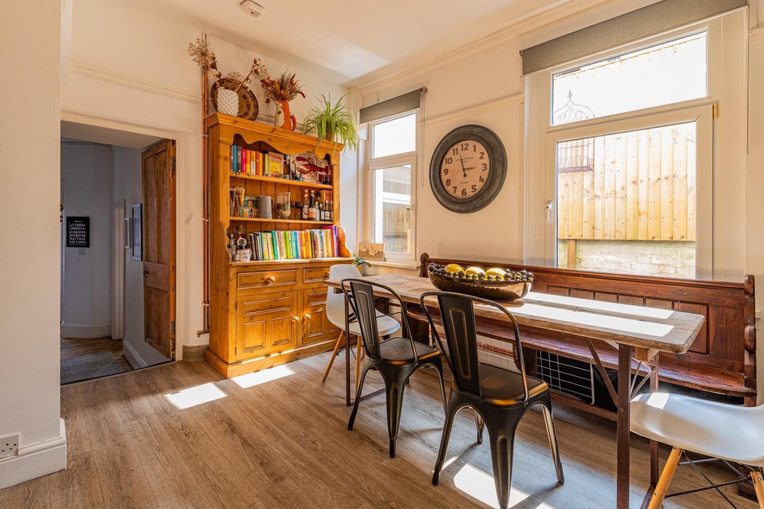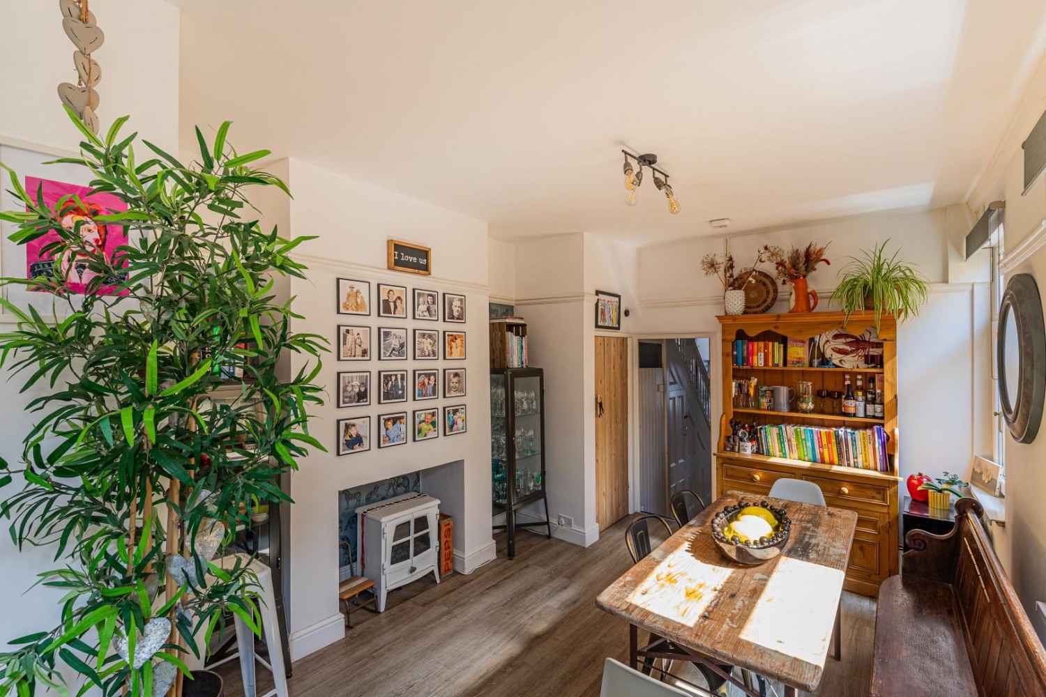 Generous living room with space for table & chairs, 2 windows to side, built in cupboard to the corner.