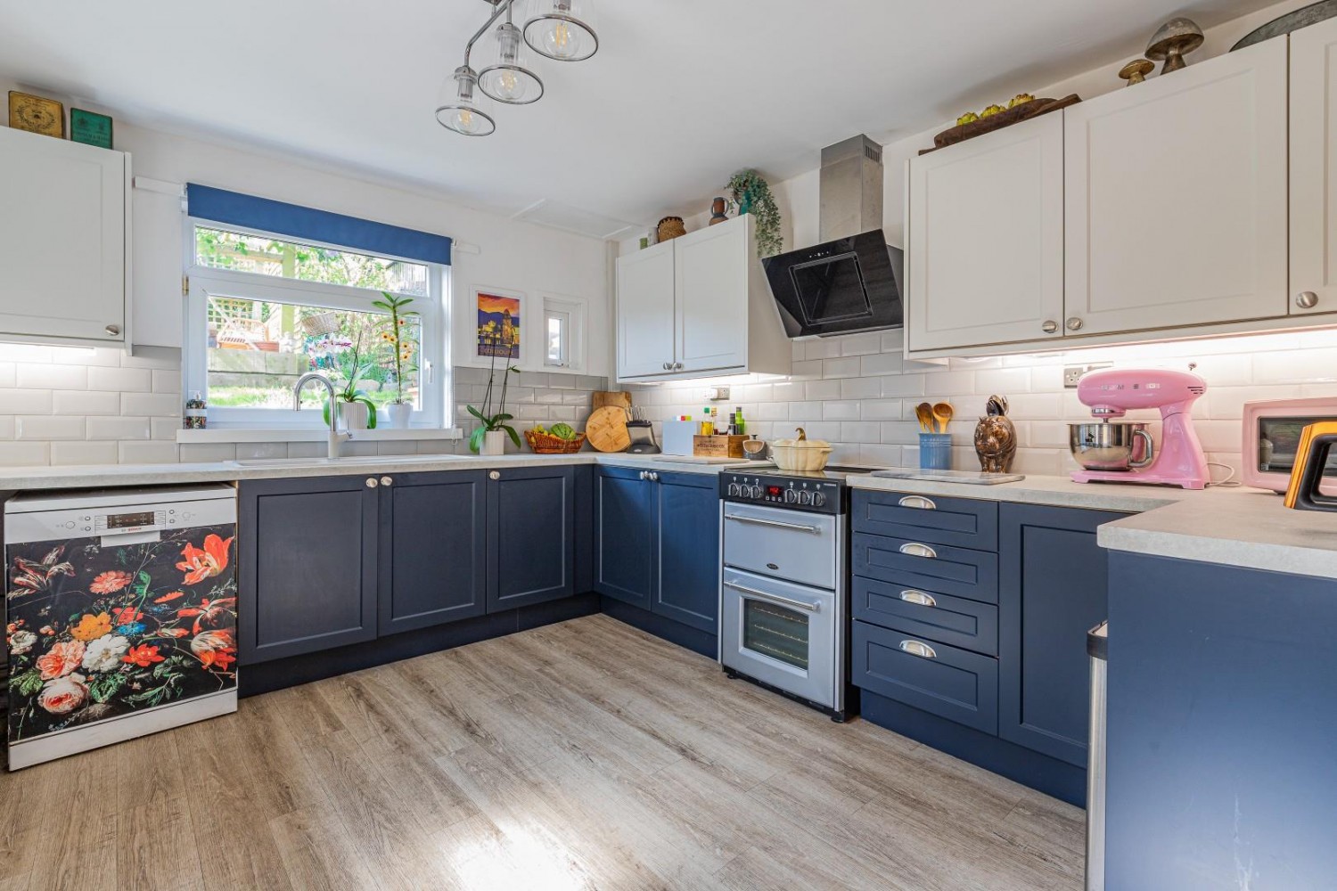 Refitted with an extensive range of contemporary 2 tone wall and base units with laminate worktop and inset one & half bowl sink & drainer with mixer tap and bevel tiled splash backs, plumbed for dishwasher and washing machine with space for tumble drier and fridge/freezer, electric cooker with cooker hood over, soft close doors & drawers, 2 windows to rear plus side window and door to the garden.