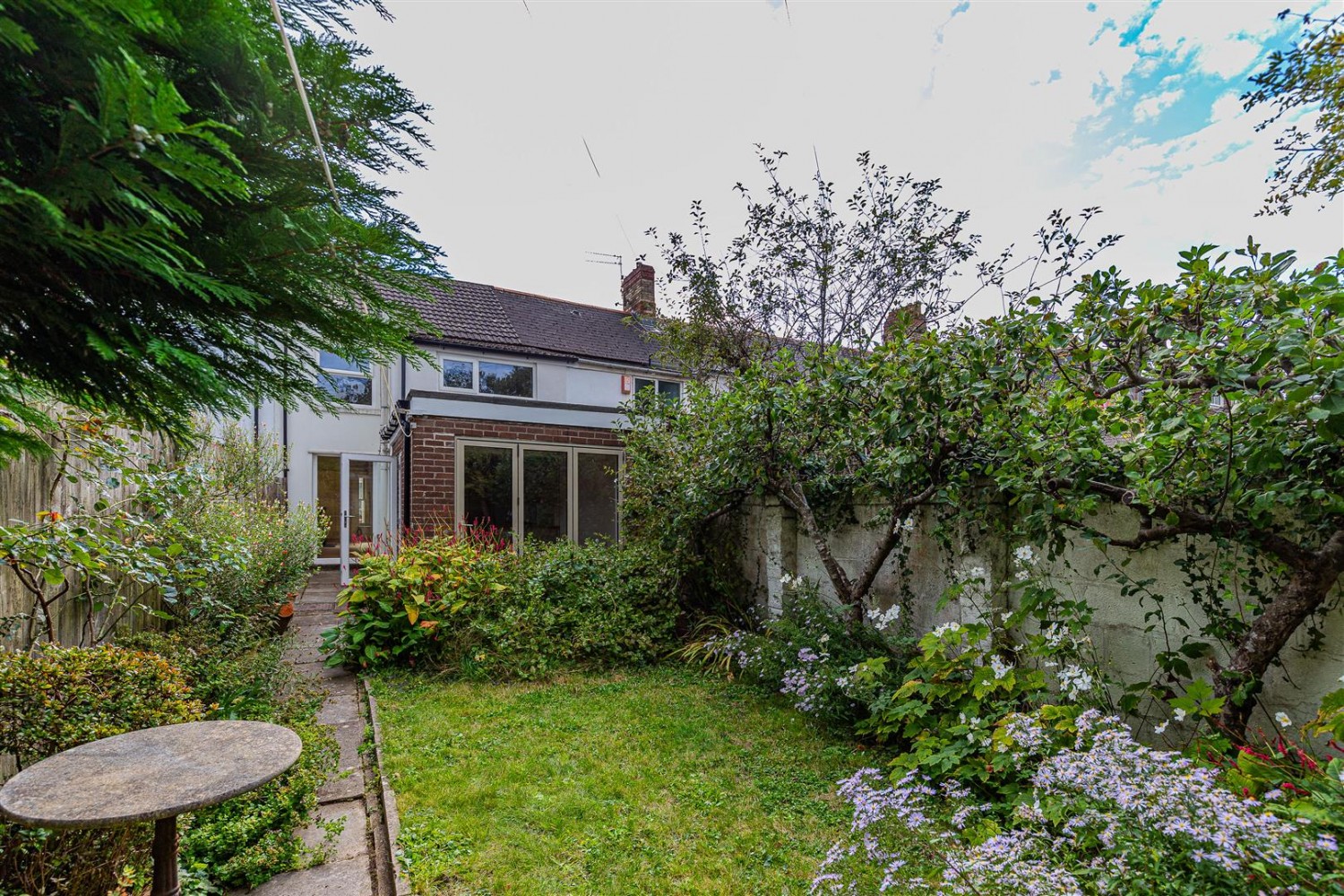 The accommodation comprises an inviting entrance hallway leading into a spacious open-plan living and dining area, featuring elegant bay-fronted windows that flood the space with natural light. To the rear, a modern extended kitchen boasts high-quality fitted units, integrated appliances, and stunning bi-fold doors that open onto a well-maintained rear garden. The outdoor space includes a lawn, patio area, and a practical outhouse—ideal for storage or a home office.