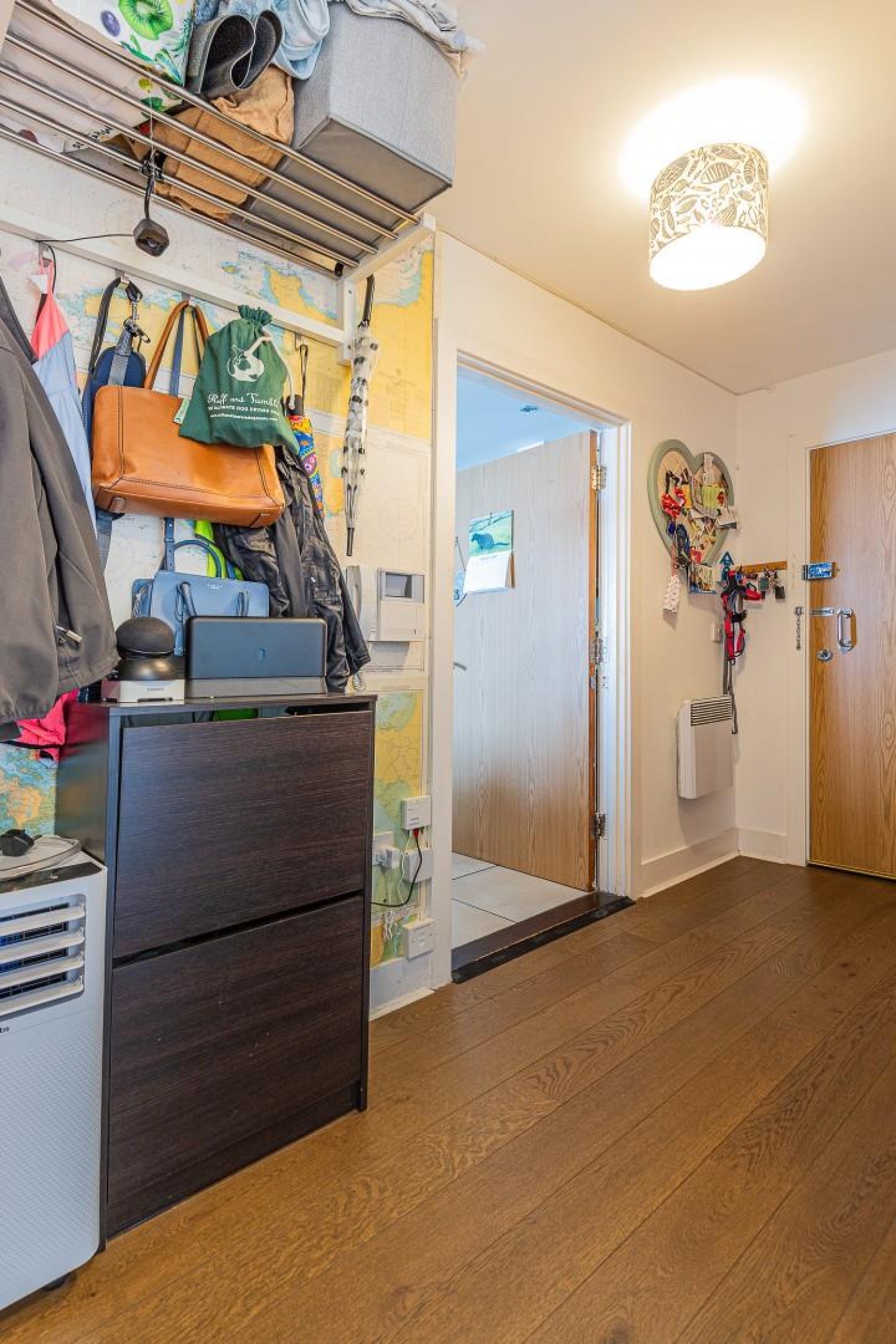 Spacious hall leading to all rooms, entry phone, generous cloaks cupboard housing the hot water tank, light, engineered wood flooring.