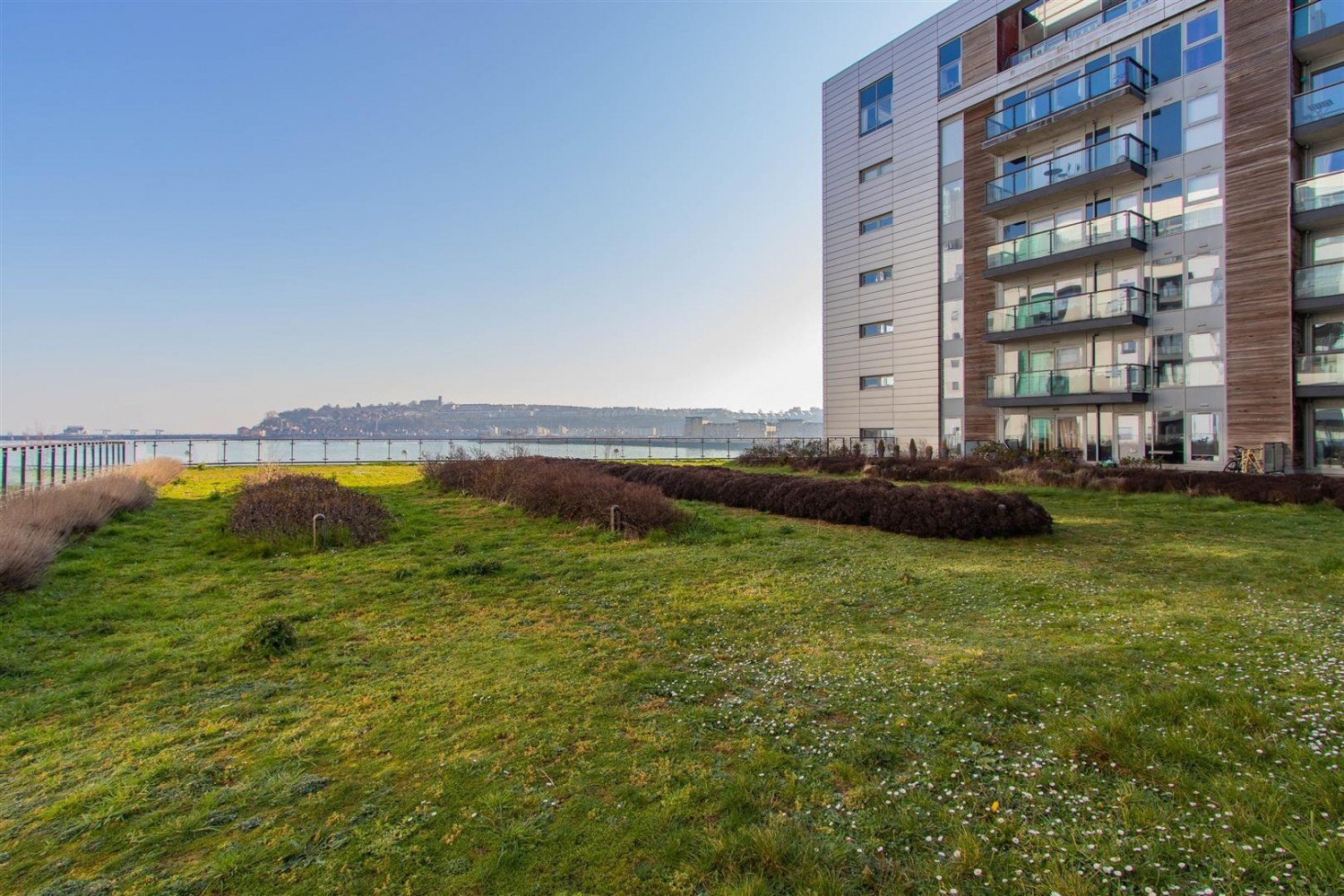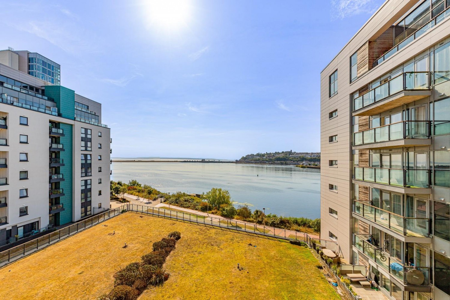 Located on the fourth floor and benefitting from a glass fronted balcony with spectacular water views towards Penarth and overlooking the large communal roof top lawn below.