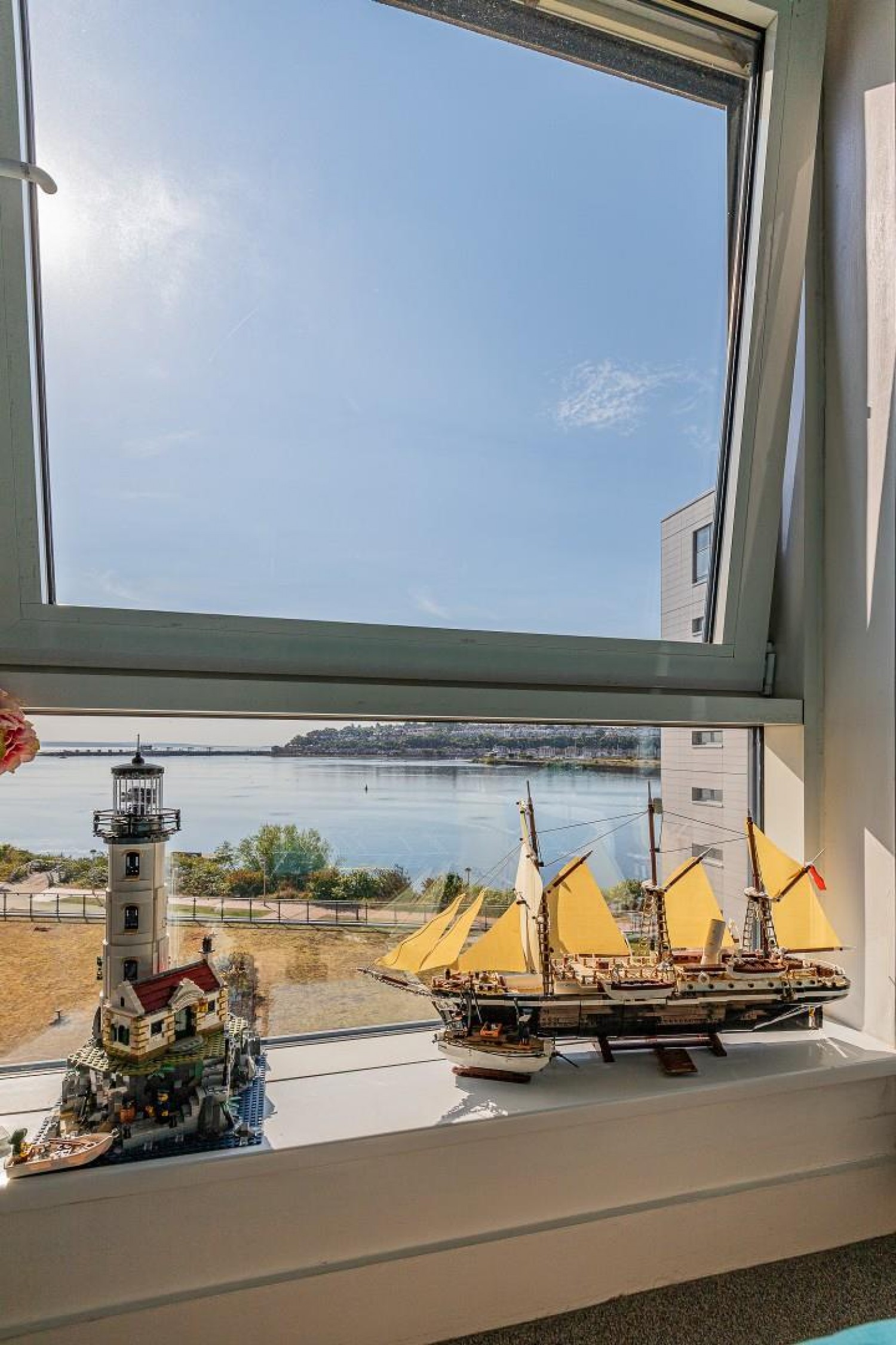 Superb open plan room combining the living area and the kitchen, lounge with wide patio doors leading out onto the glass fronted balcony with its commanding water view, TV point, telephone point, engineered wooden floor.