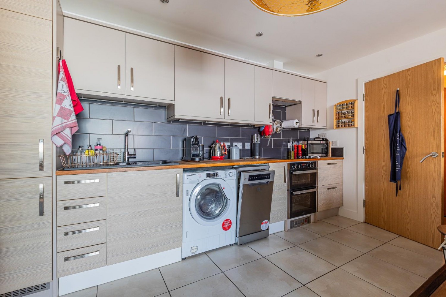 Kitchen area fitted with a modern range of contemporary wall and base units with solid wood worktop and inset one & half bowl sink & drainer with mixer tap and tiled splash backs, integrated fridge, freezer, washing machine with dishwasher to remain plus built in double oven, hob, cooker hood, porcelain tiled floor.