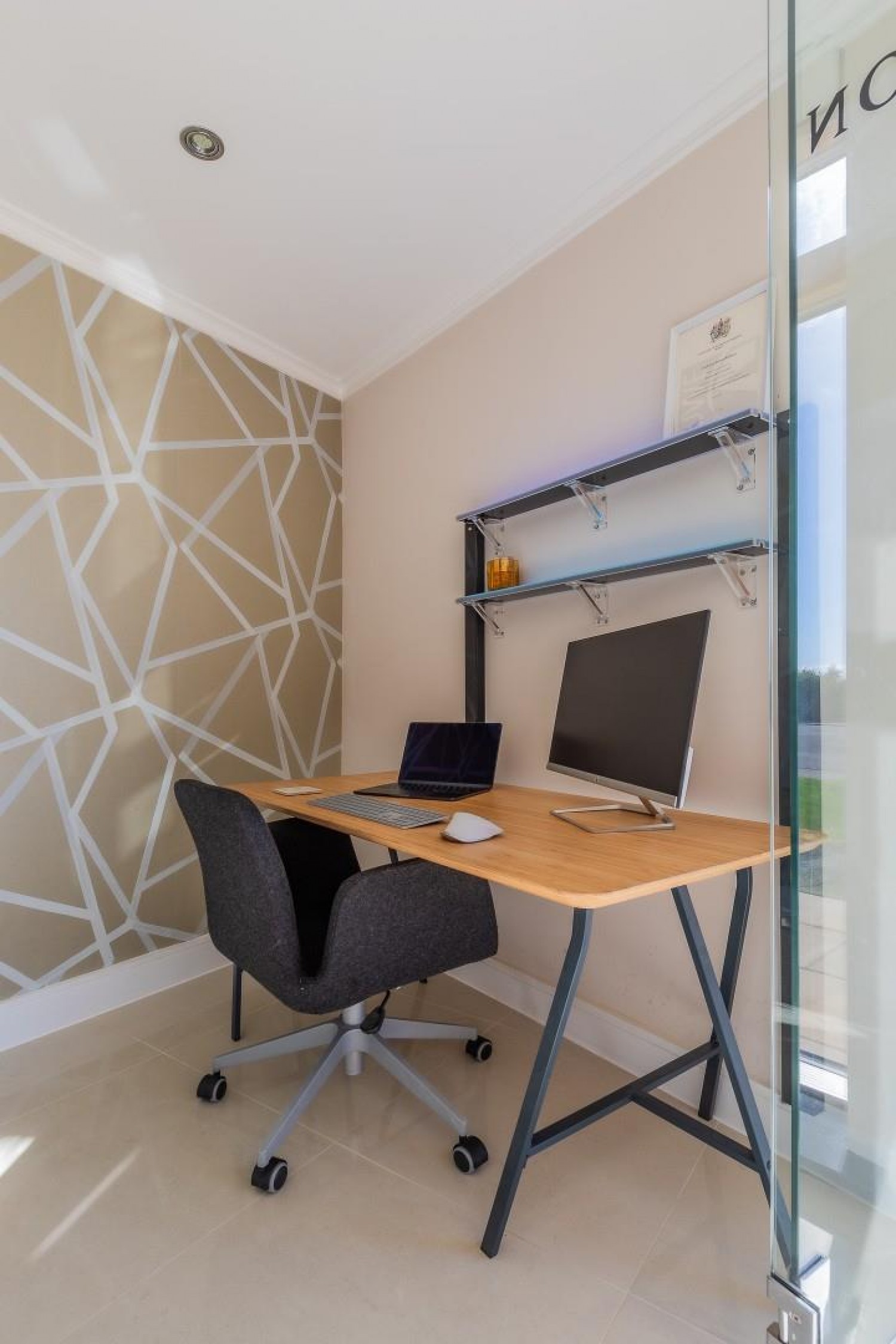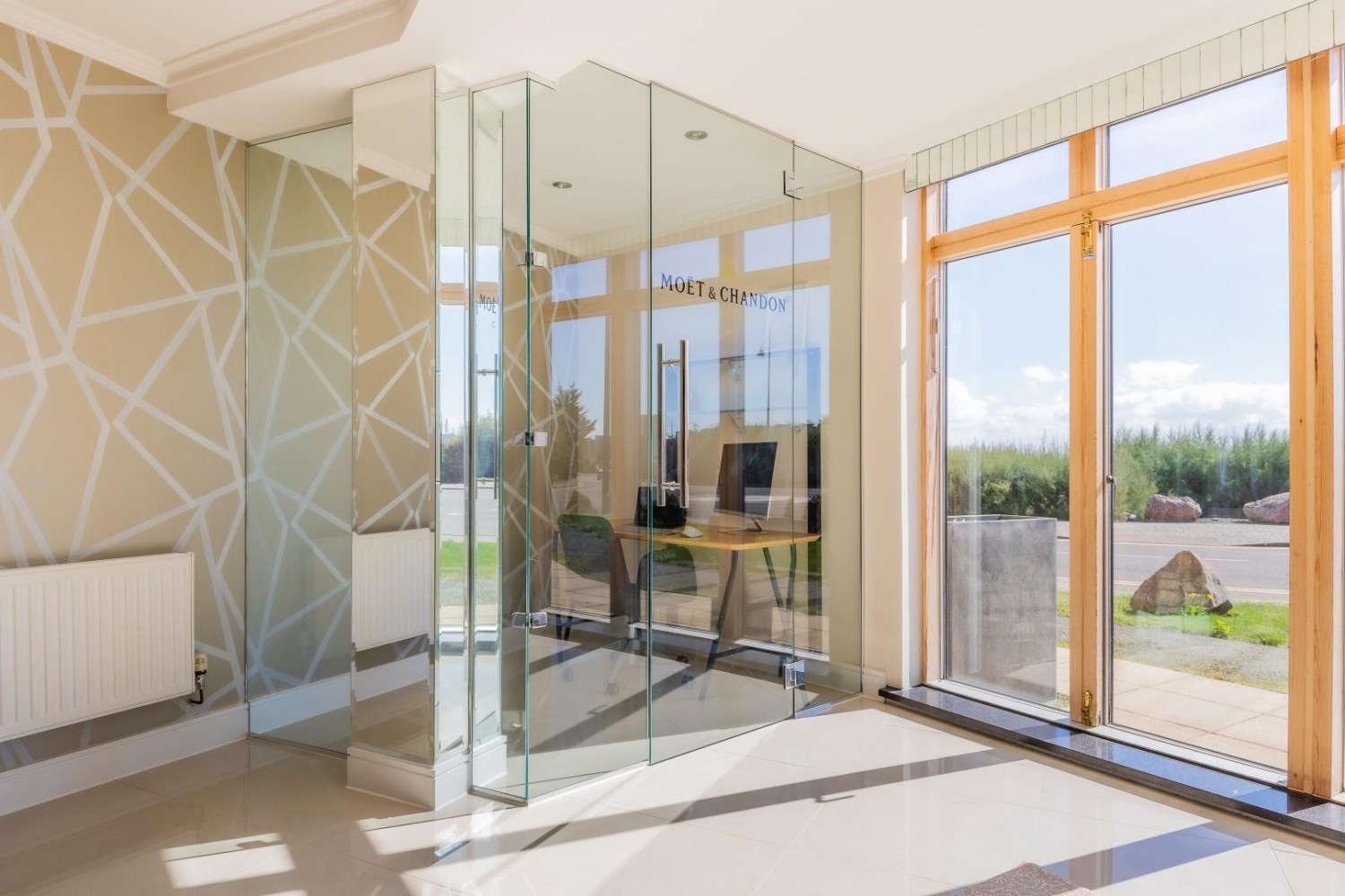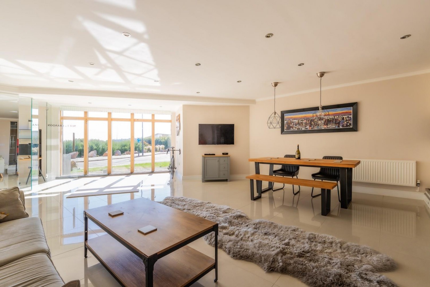 Living and dining area spacious in itself with porcelain tiled flooring and contains a bespoke glass study area to the corner with bespoke glass door gaining entry, TV point.