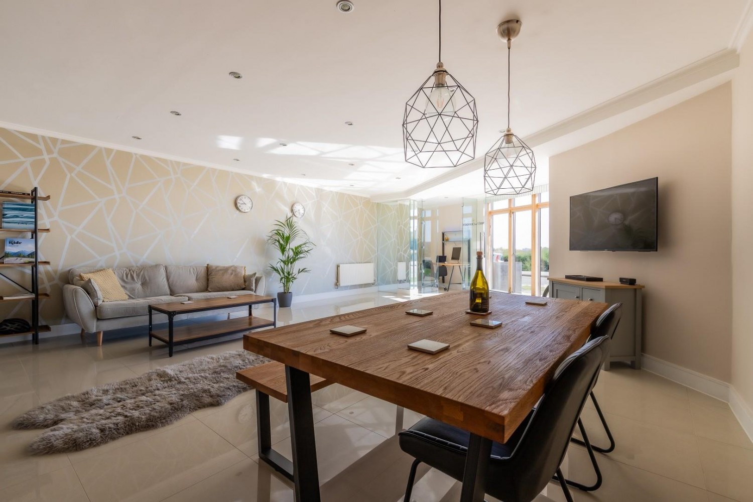 Enter from the hall via bespoke glass walls incorporating glass twin doors into the heart of the apartment - a stunningly contemporary open plan room combining living and dining with the kitchen and boasting twin French doors opening out onto a dedicated terraced patio fronting the wetlands towards the bay itself.