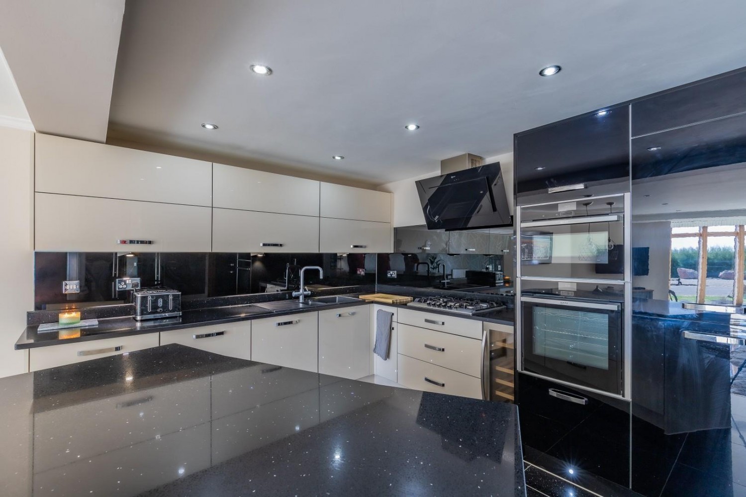 The kitchen - extensively fitted with a contemporary range of Hi Gloss wall and base units including solid granite worktop with an under mounted sink and mixer tap inclusive of a 'Hamstrom' instant hot & filtered water tap, integrated appliances include fridge, freezer, dishwasher, washing machine plus built in 'Hide & slide' fan oven plus 5 combo microwave oven, 5 ring gas hob with cooker hood over plus a built in wine chiller, features include a large island unit, soft close doors & drawers, under lighting plus plinth LED lighting, granite flooring.