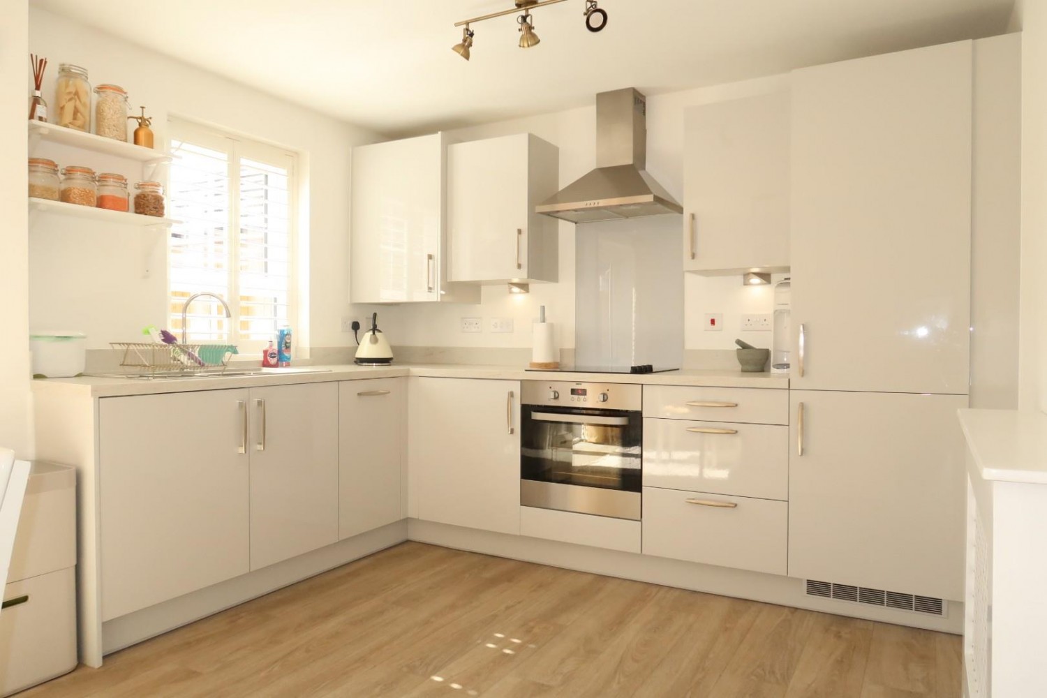 Spacious room with space for dining table & chairs, French doors lead into the garden, range of modern wall and base units with laminate worktop and inset stainless steel sink & drainer with mixer tap, soft close doors & drawers, corner carousel unit plus under lighting, integrated fridge, freezer, slimline dishwasher plus washing machine and built in oven, hob & hood, window to rear, concealed gas boiler.