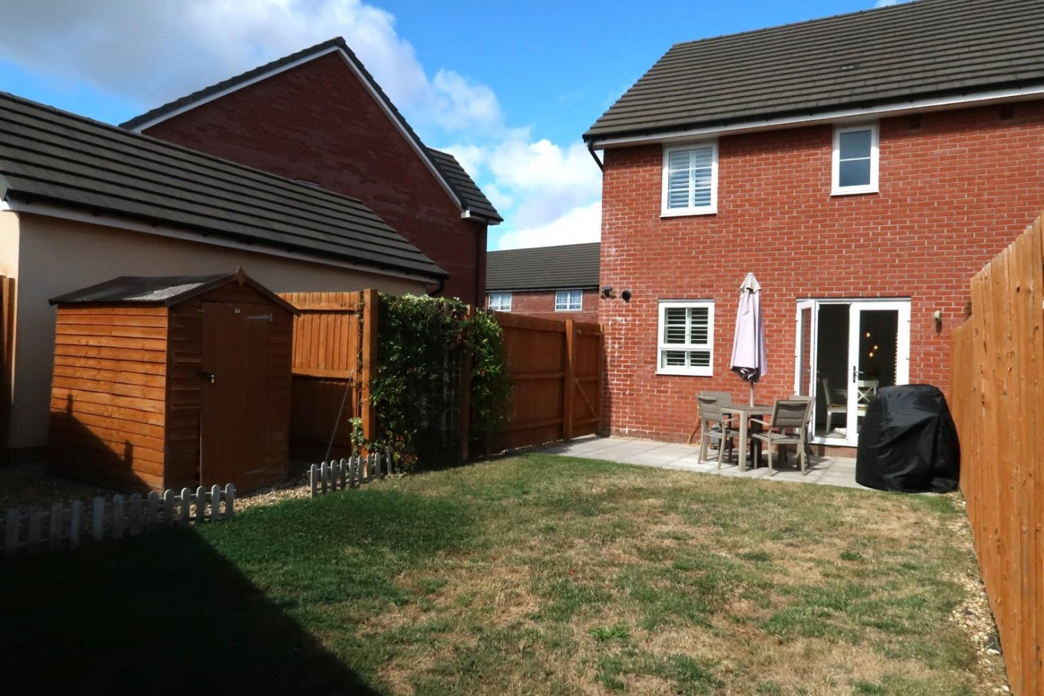 Generous enclosed rear garden - Southerly facing, fenced with side gate, mainly laid to lawn with paved patio - outside tap, rear area with stone chippings and wooden garden shed.