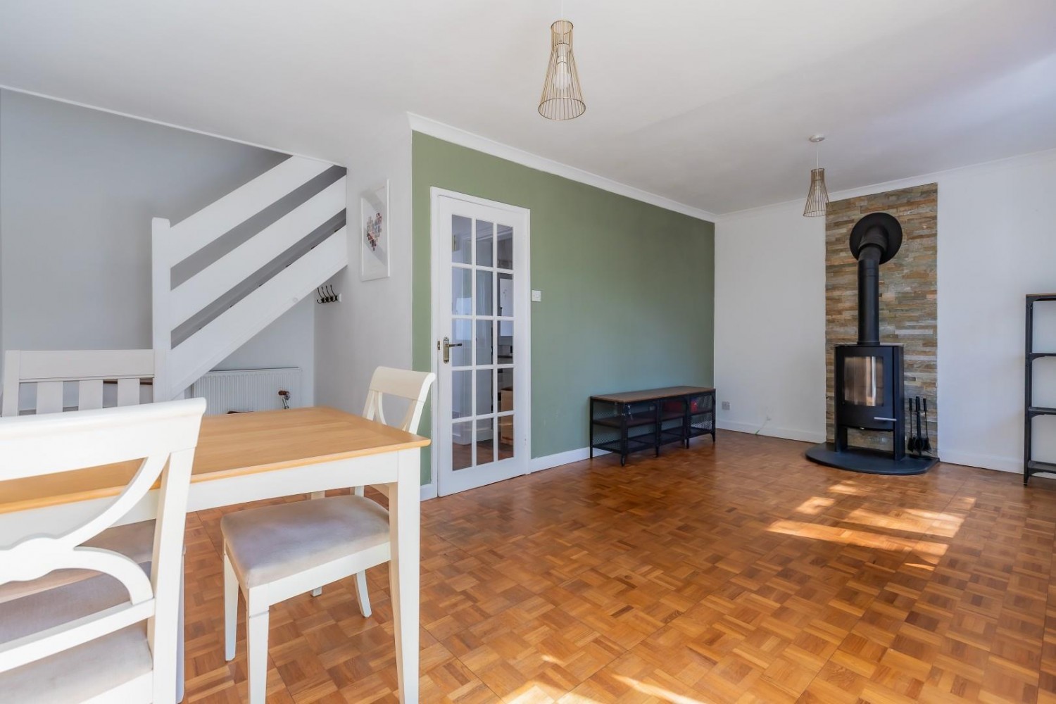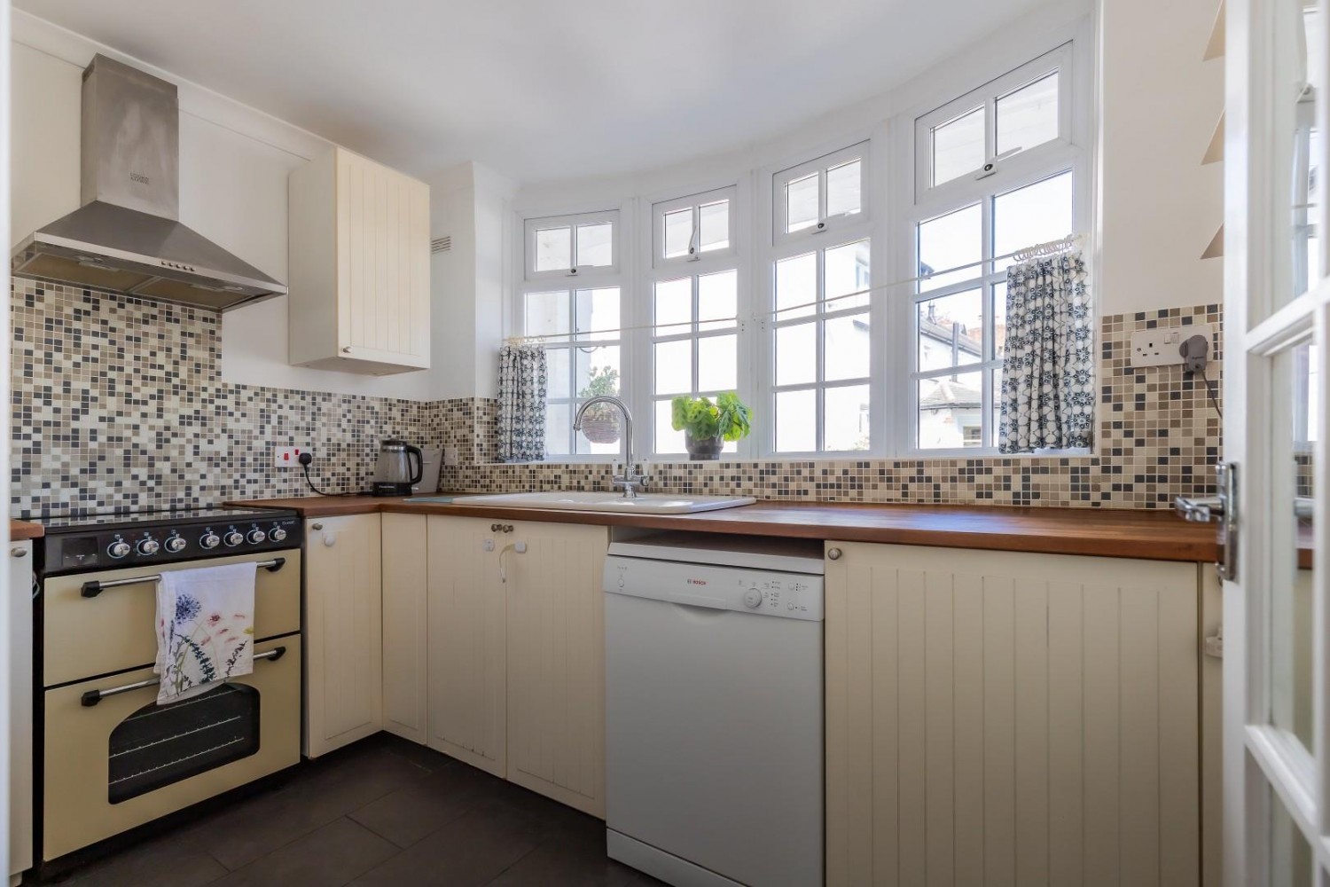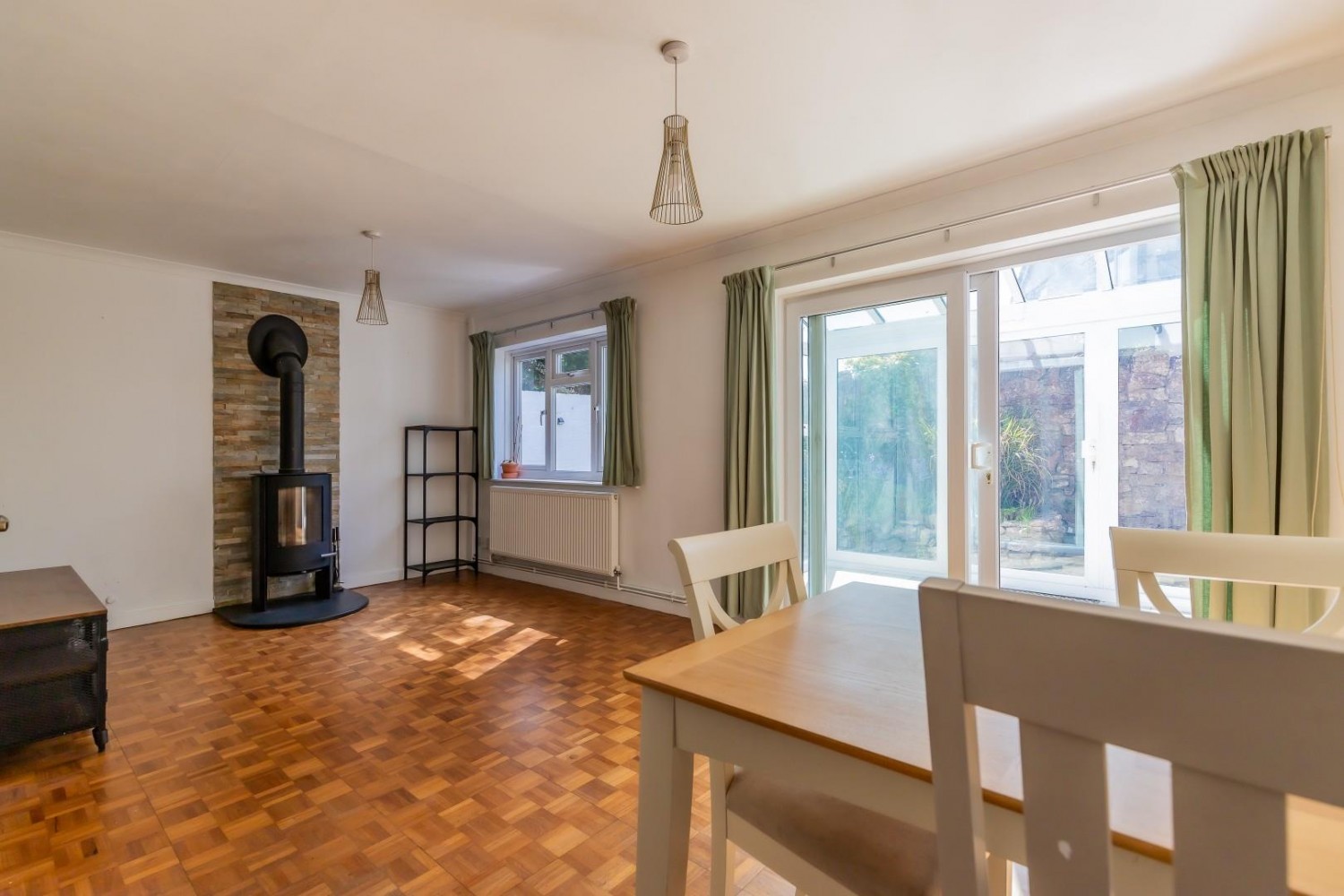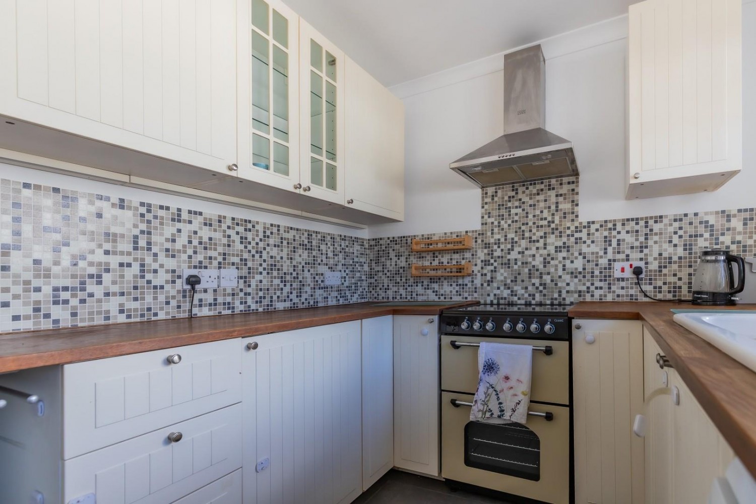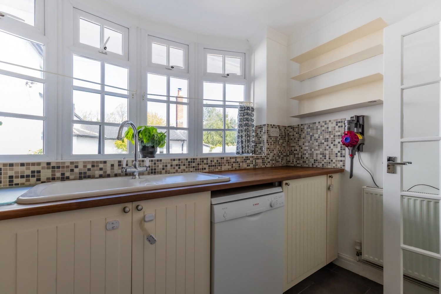 Entered via a hardwood front door which leads into an inner hallway which in turn has doors leading to the cloakroom, kitchen and living area. The open plan living area features and impressive modern wood burning stove on a slate hearth and has wood block flooring throughout. Patio doors lead to a good size conservatory/garden room which in turn opens onto a small private walled garden. The kitchen has a bow window to the front elevation and is fitted with a range of units on three sides with ample work surfaces and a sink, drainer and mixer tap. There is space for an oven with a fittred cooker hood a space and plumbing for a washing machine or dishwasher. There is also a built-in fridge and freezer.