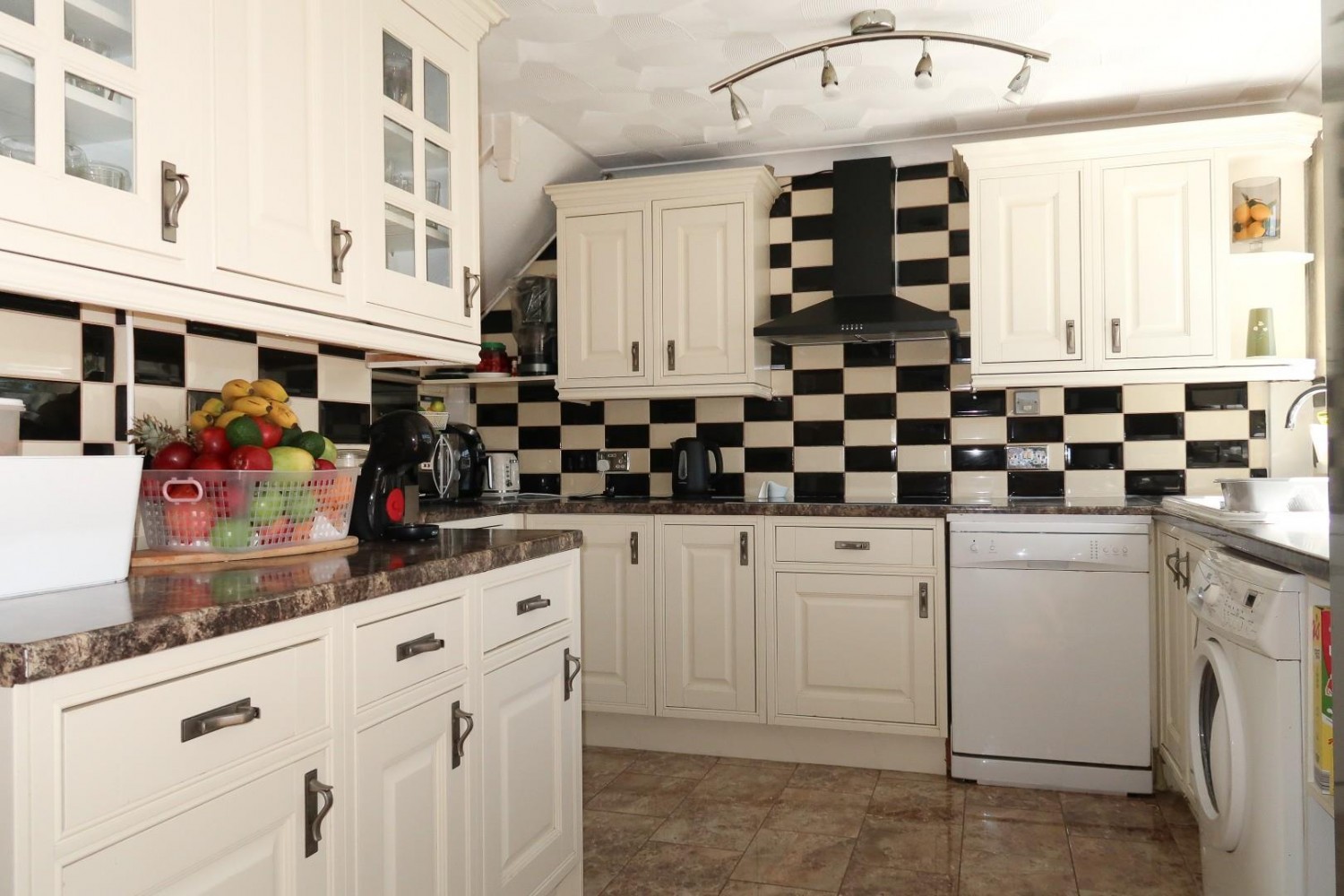 With room for dining table & chairs and direct access into the conservatory, kitchen extensively fitted with a modern range of cream wall and base units with round edge worktop and inset China one & half bowl sink & drainer with mixer tap and bevel tiled splash backs, features include glazed cabinets plus corner carousel unit, tiled floor, window to rear, space for an American style fridge/freezer, plumbed for washing machine & dishwasher plus built in double oven, 5 ring gas hob & cooker hood.
