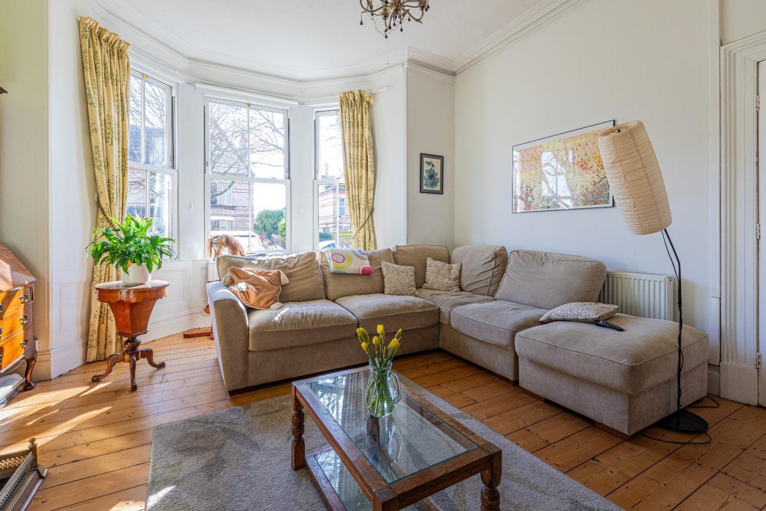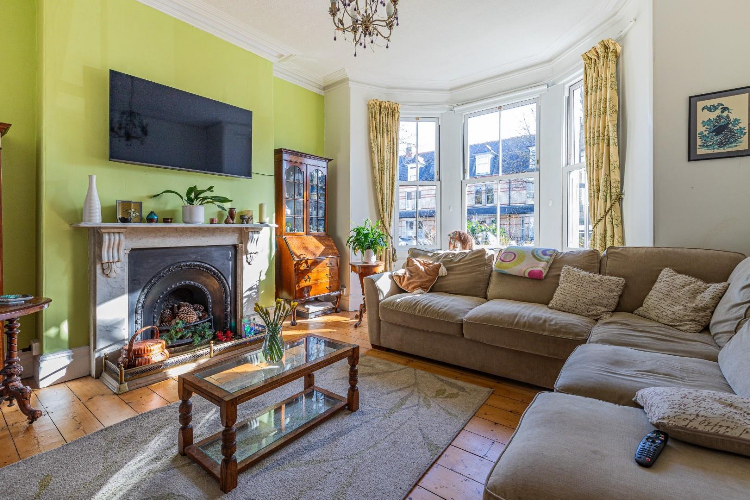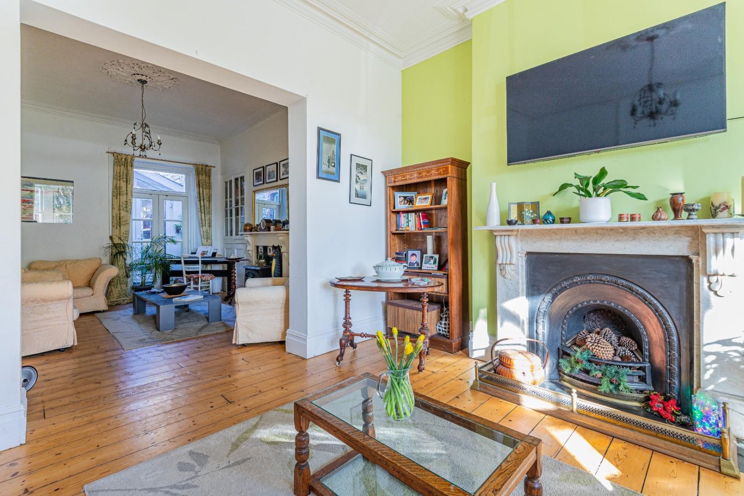 Elegant main living room open to the sitting room, deep bay window to front - upvc sash windows, exposed natural floor boards, TV point, magnificent Antique marble fireplace, original coving and ceiling rose.