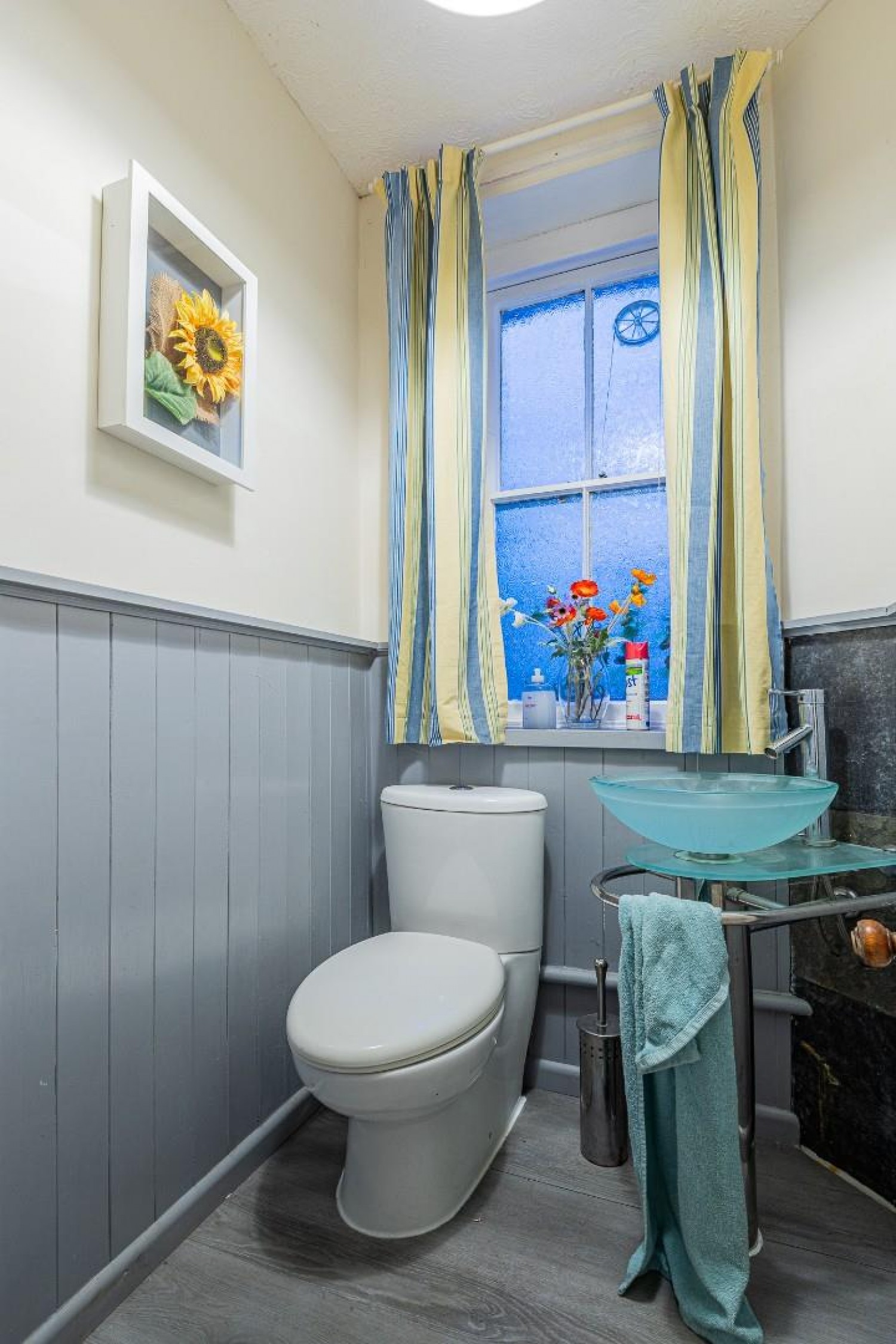 Fitted with a modern suite comprising a chrome pedestal with round glass wash basin and close coupled wc, window to side.