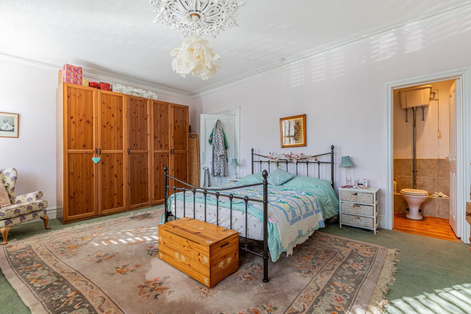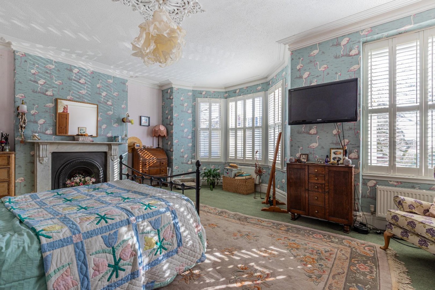 Impressively large master bedroom, deep bay upvc sash window and window to the front with fitted bespoke plantation shutters, original Marble Antique fireplace, original coving & ceiling rose, fitted wardrobes to one wall.