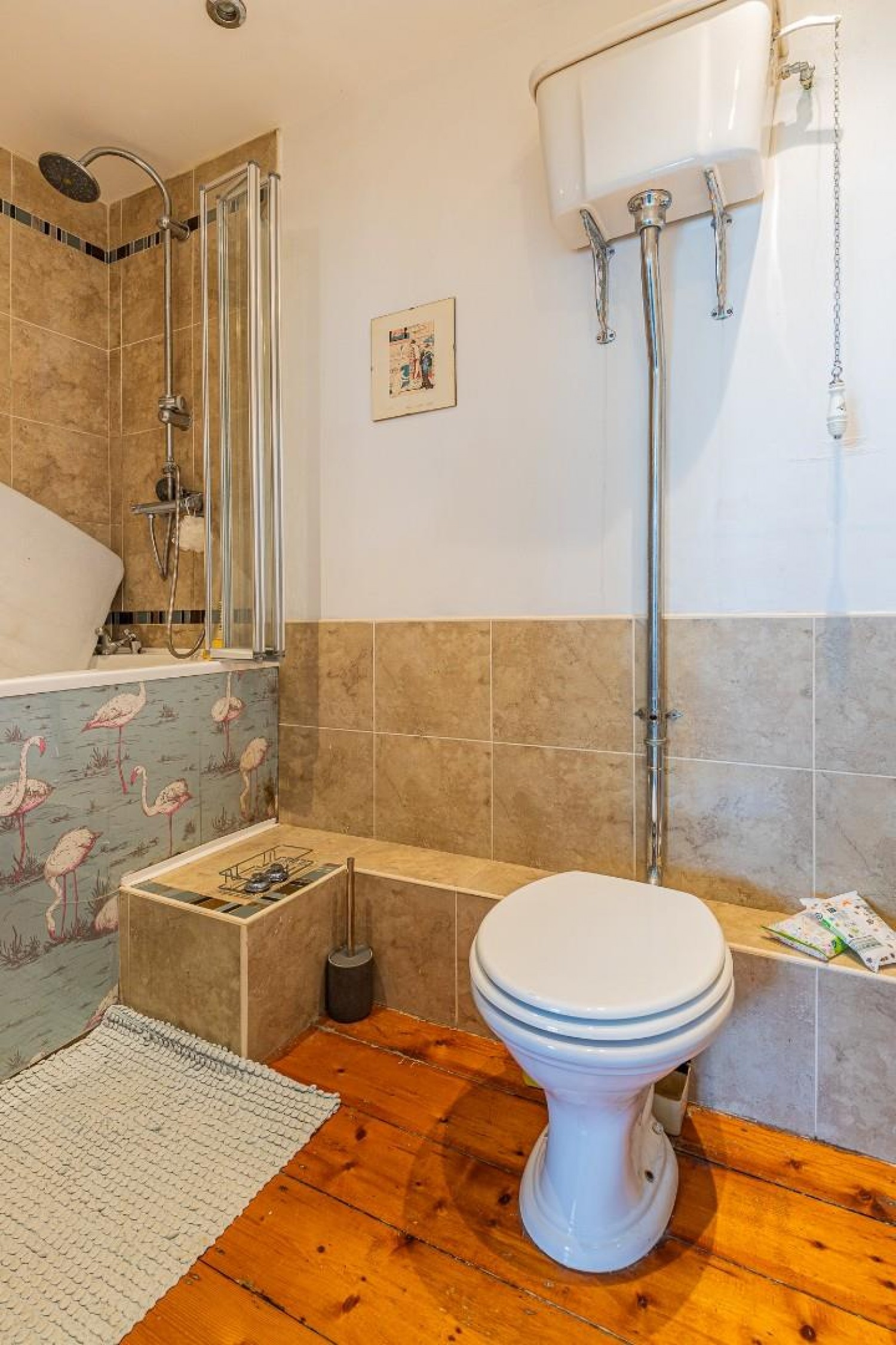 Cleverly designed to incorporate a deep 'Sit In' panel Jacuzzi bath with seating and shower over and folding glass screen, vanity wash hand basin and high level wc, tiled surround, pine floor boards, heated chrome towel rail, extractor fan.