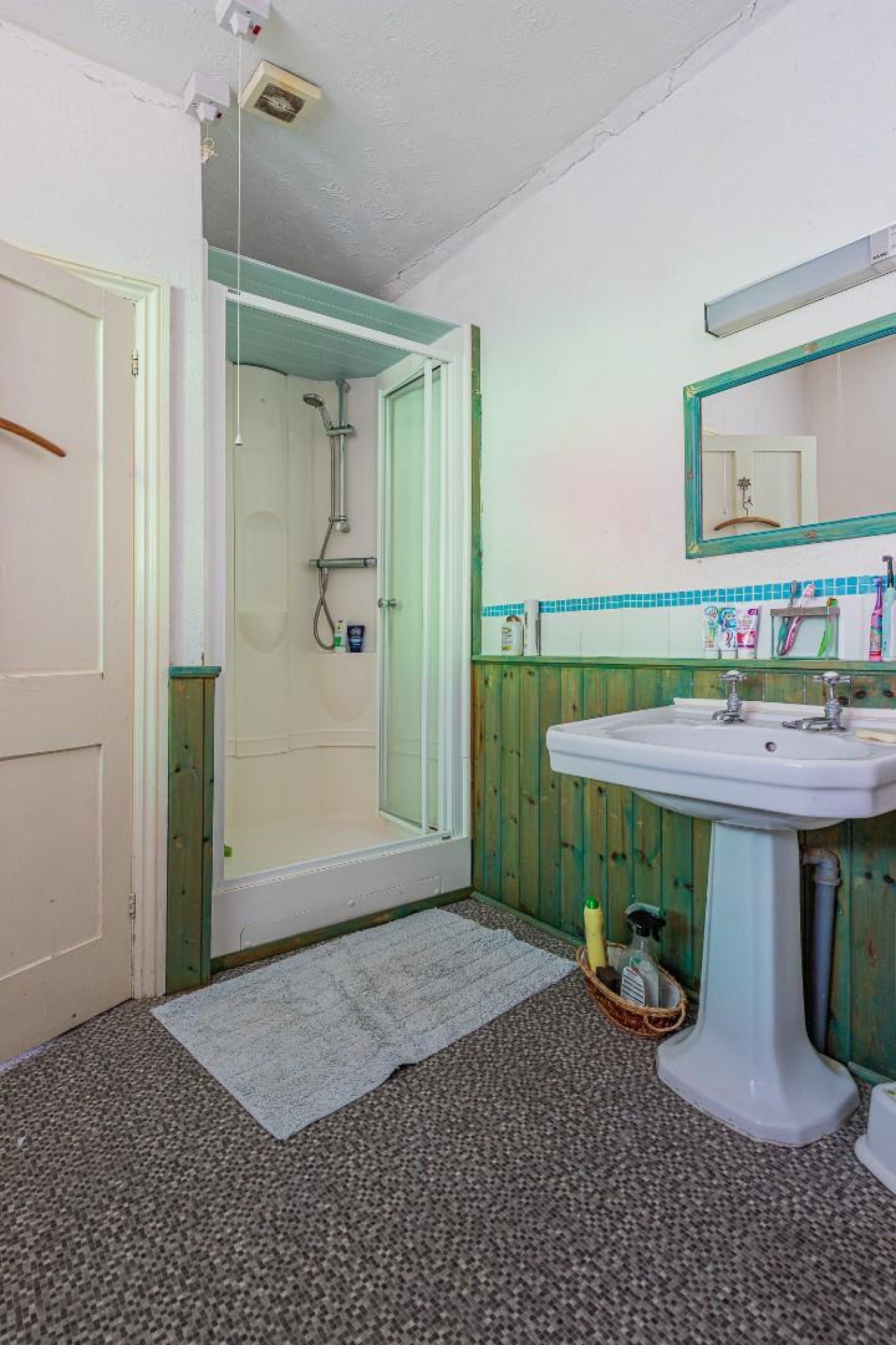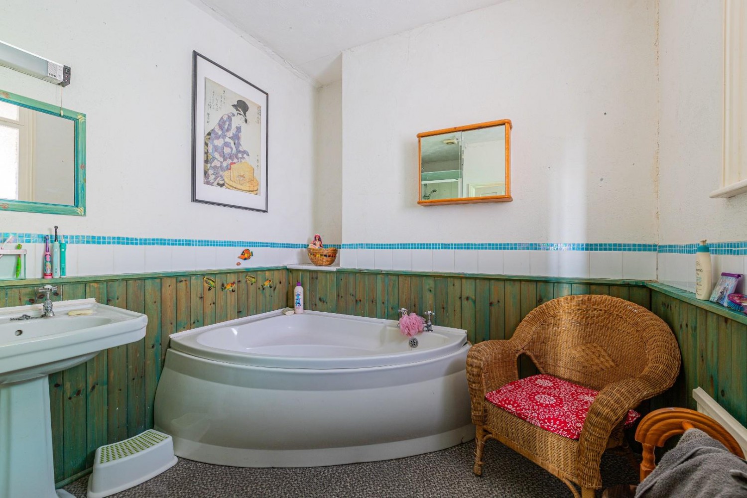 Spacious family bathroom with a white suite comprising a panel corner bath, pedestal wash hand basin and shower enclosure, window to side, tongue & groove paneling, shaver/light.