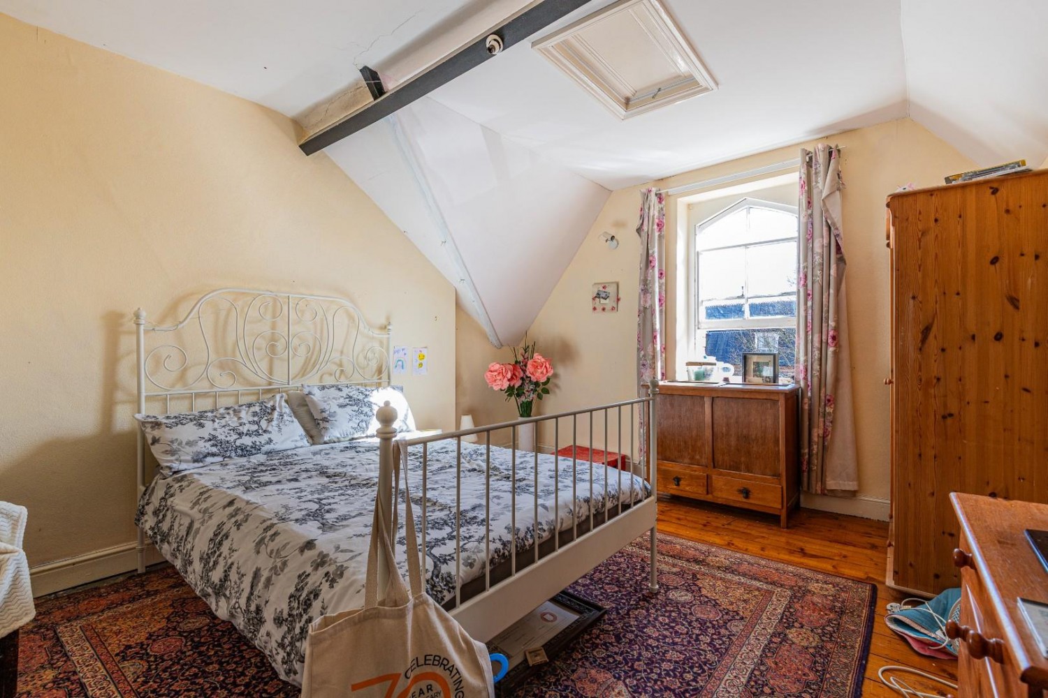 Large double bedroom, gabled ceiling, pine floorboards, window to front, loft hatch.