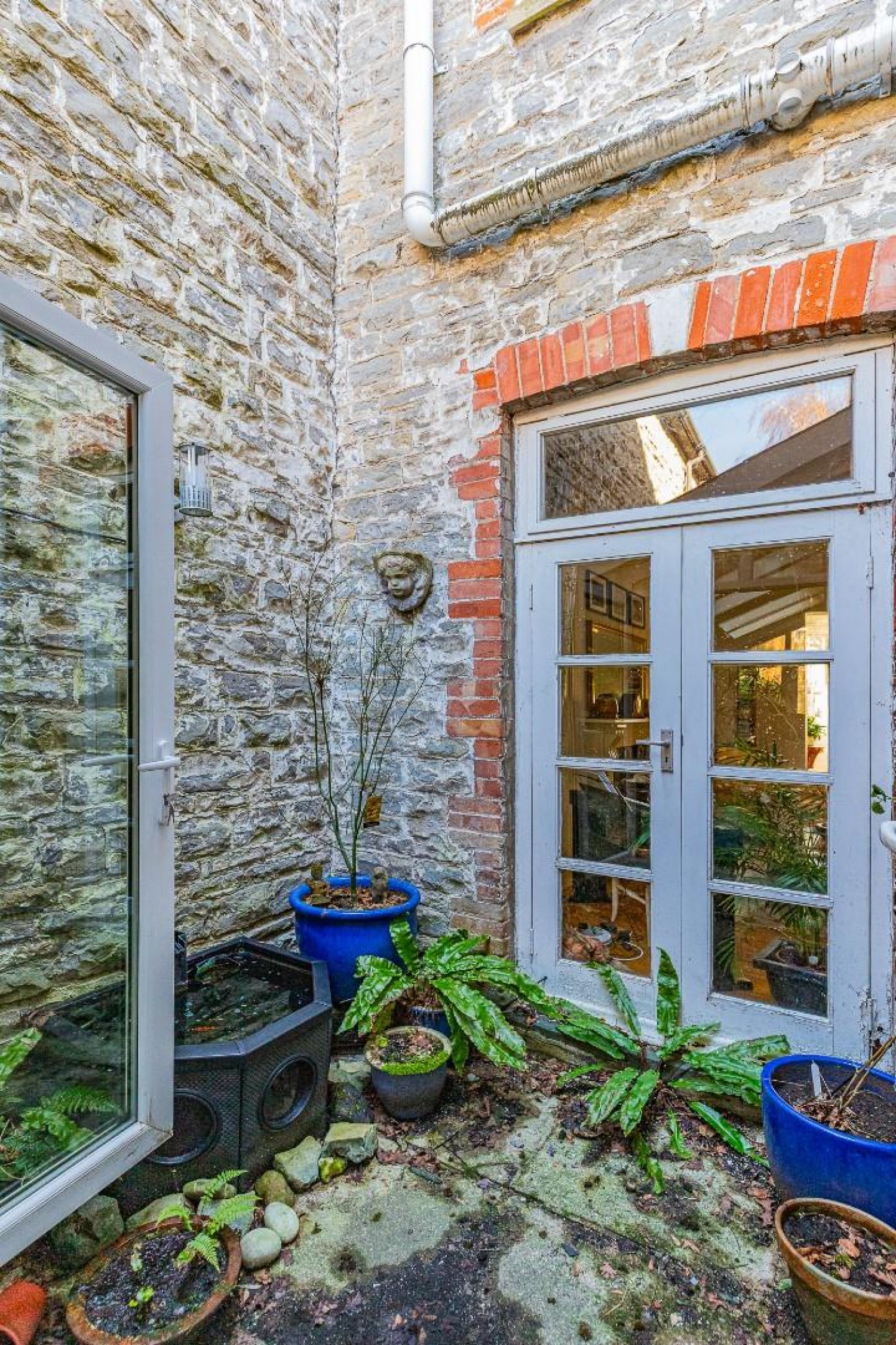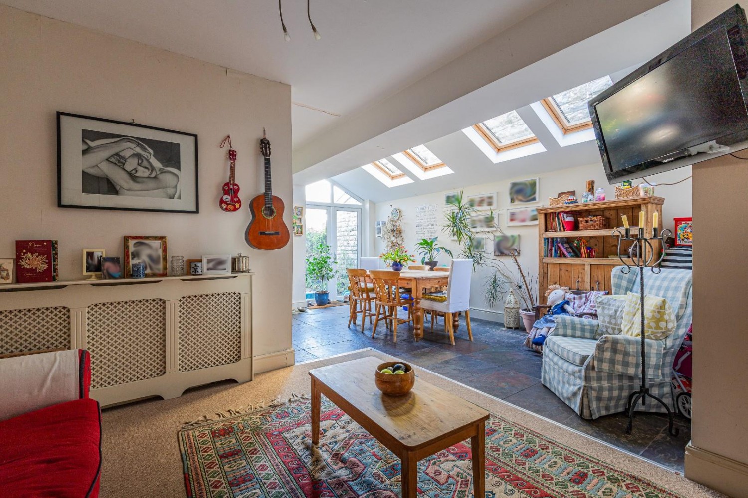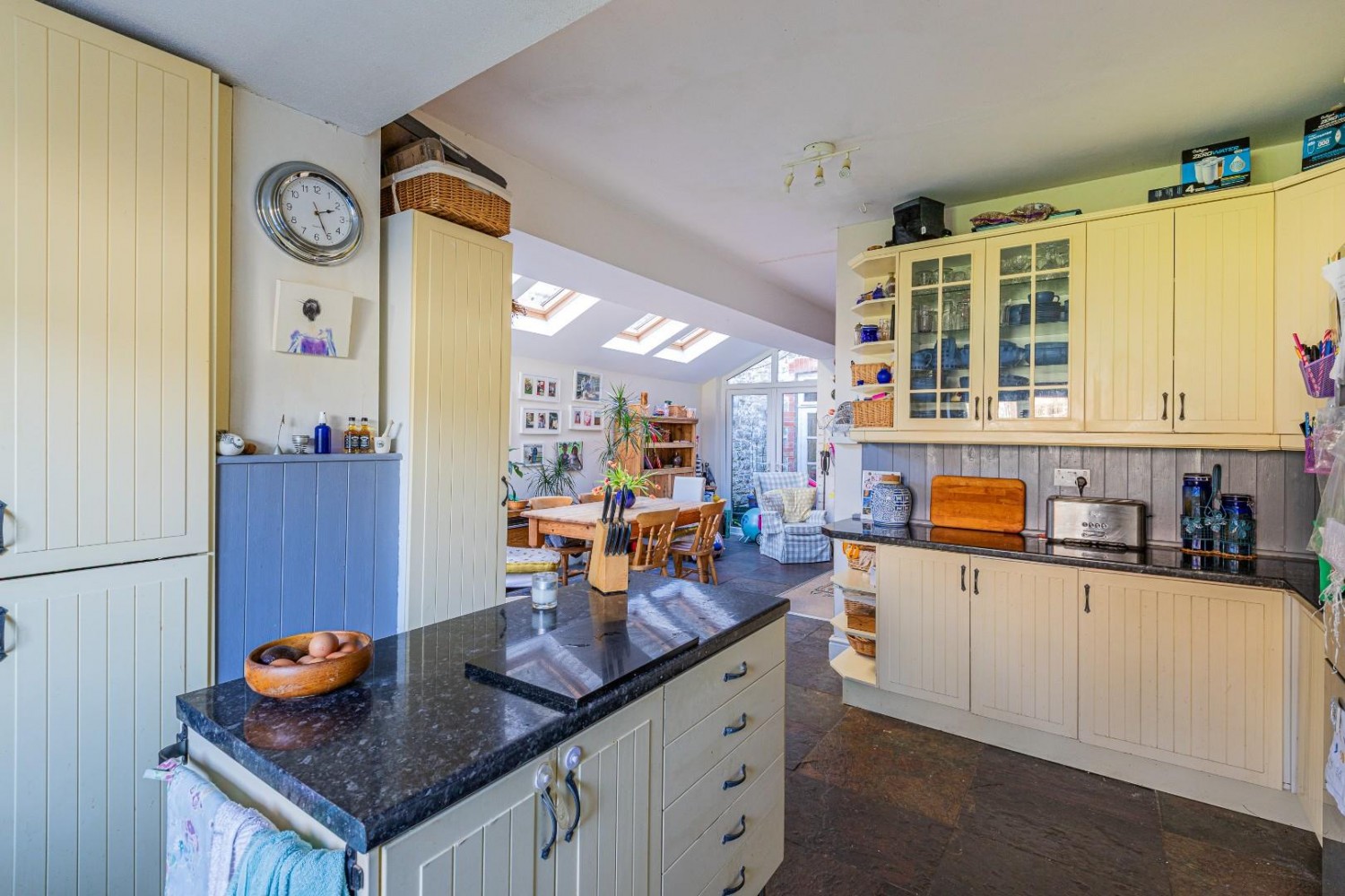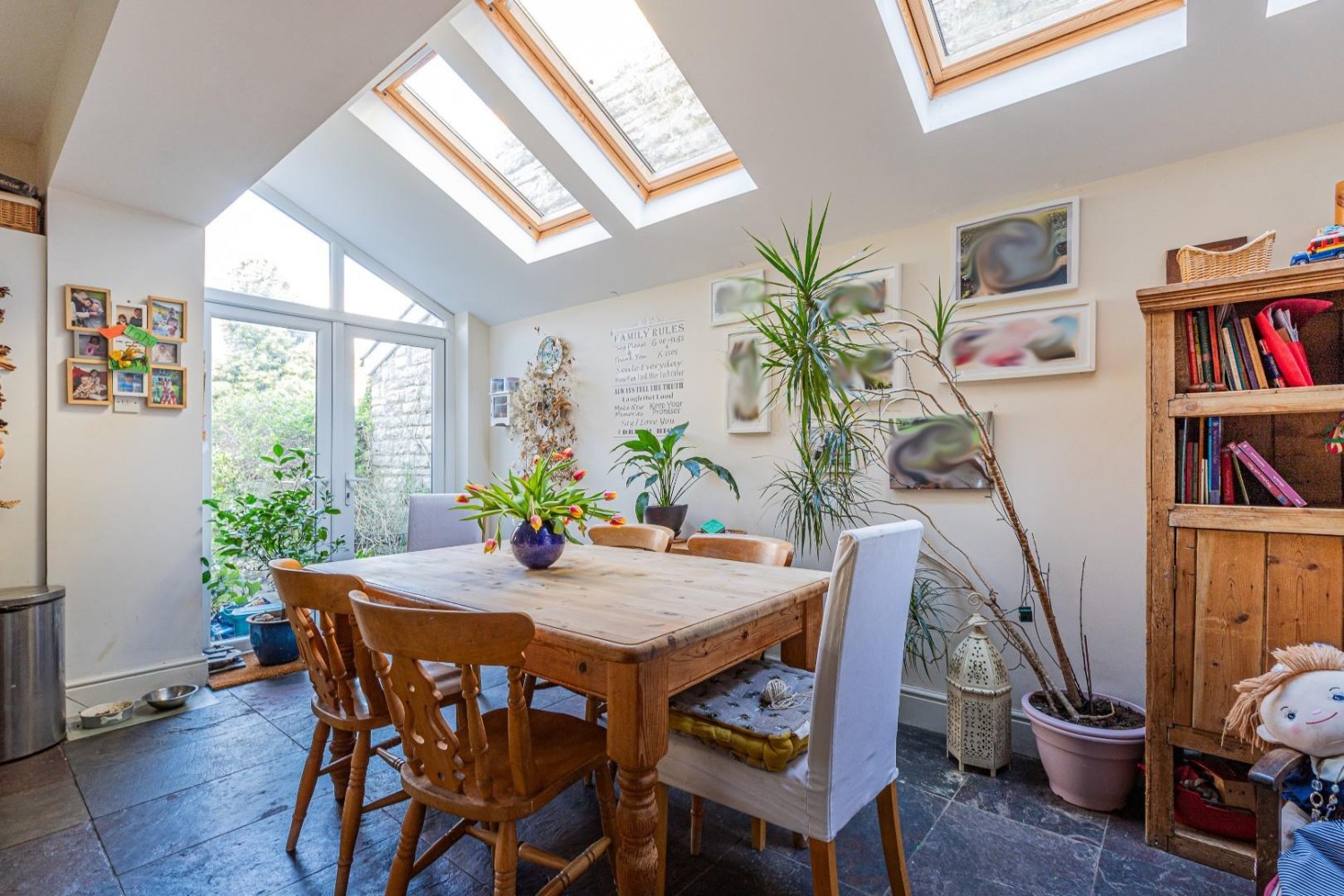 Extended to the side with sloping roof and 4 velux roof windows, slate flooring - under floor heating, open to the kitchen, upvc French doors lead to the inner courtyard and at the rear Upvc French doors lead into the garden.