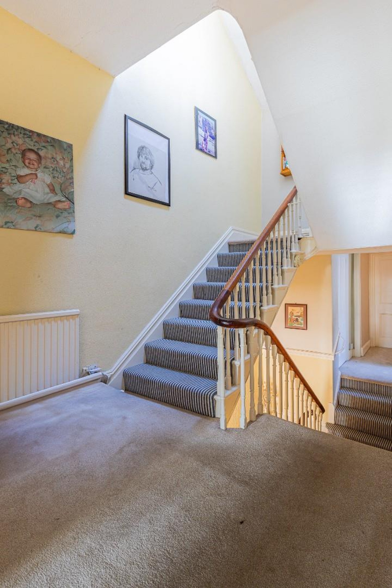 Spacious landing with stairs rising to the second floor, built in linen cupboard, rear landing has side window.