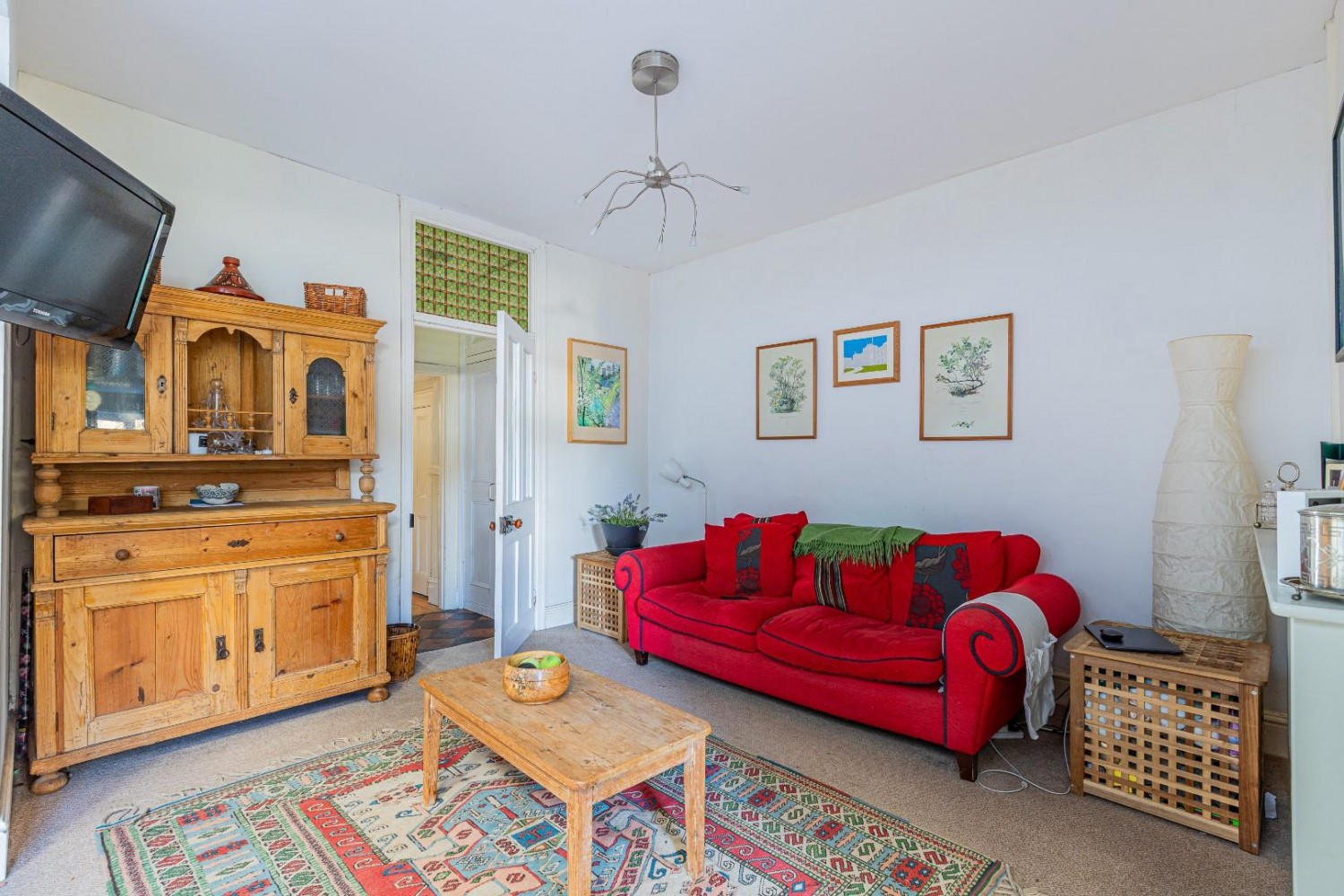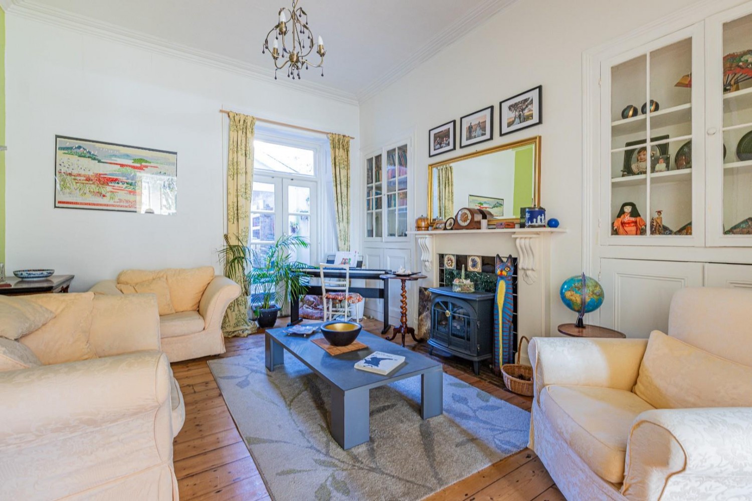 Equally elegant living room, 2 original inset glazed display cupboards with storage beneath, fireplace with Antique surround, exposed natural floorboards, original coving & ceiling rose, upvc French doors lead into a small inner courtyard with exterior light.