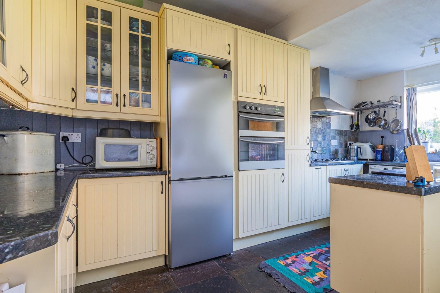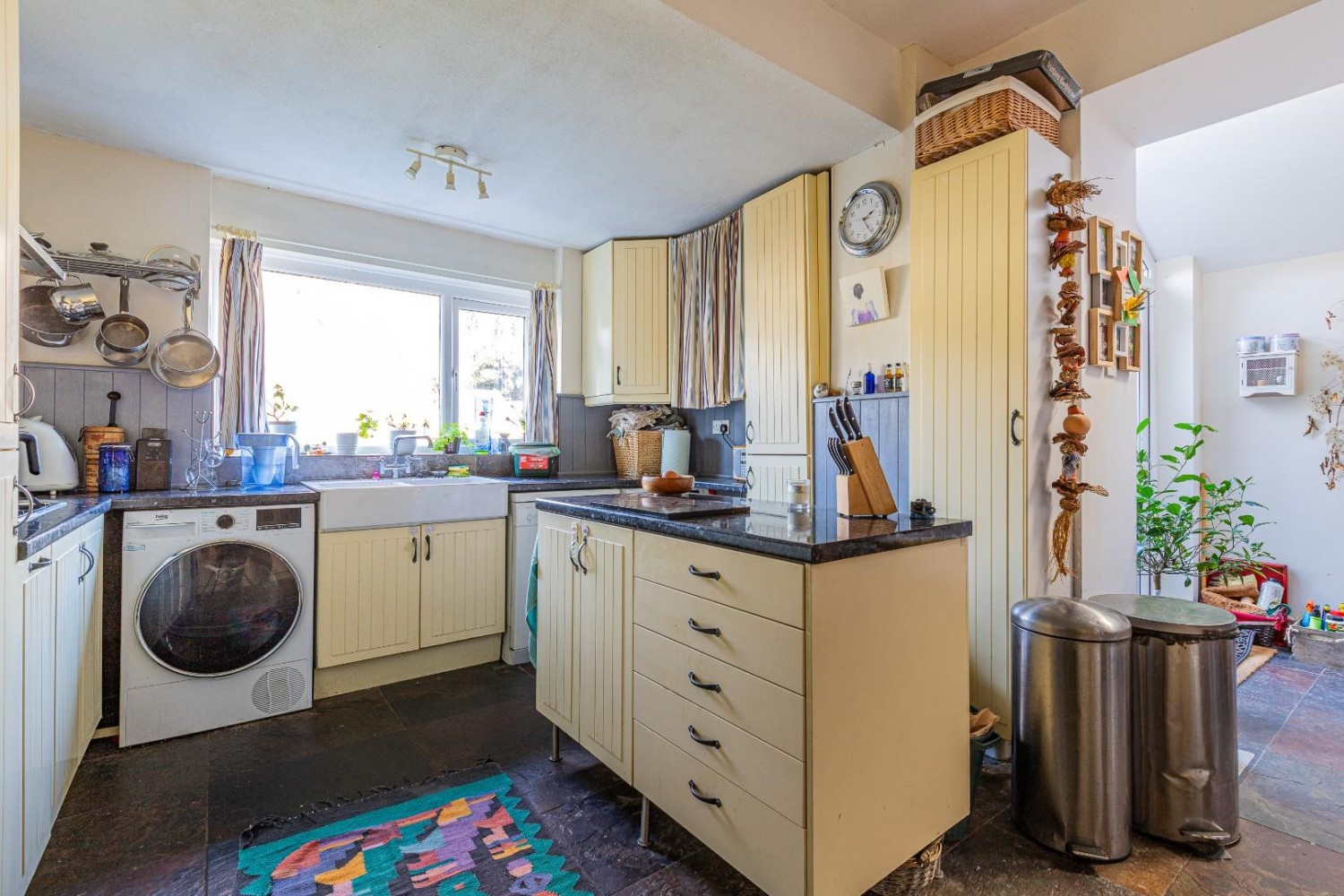 Extensively fitted with a range of wall and base units with laminate worktop and an inset China Butlers sink with mixer tap, features include a portable Island unit, integrated freezer, corner carousel unit plus cupboard with compartmental bins, plumbed for dishwasher and washing machine with space for tumble drier and fridge/freezer, built in double oven, hob & hood, window to rear, slate flooring.