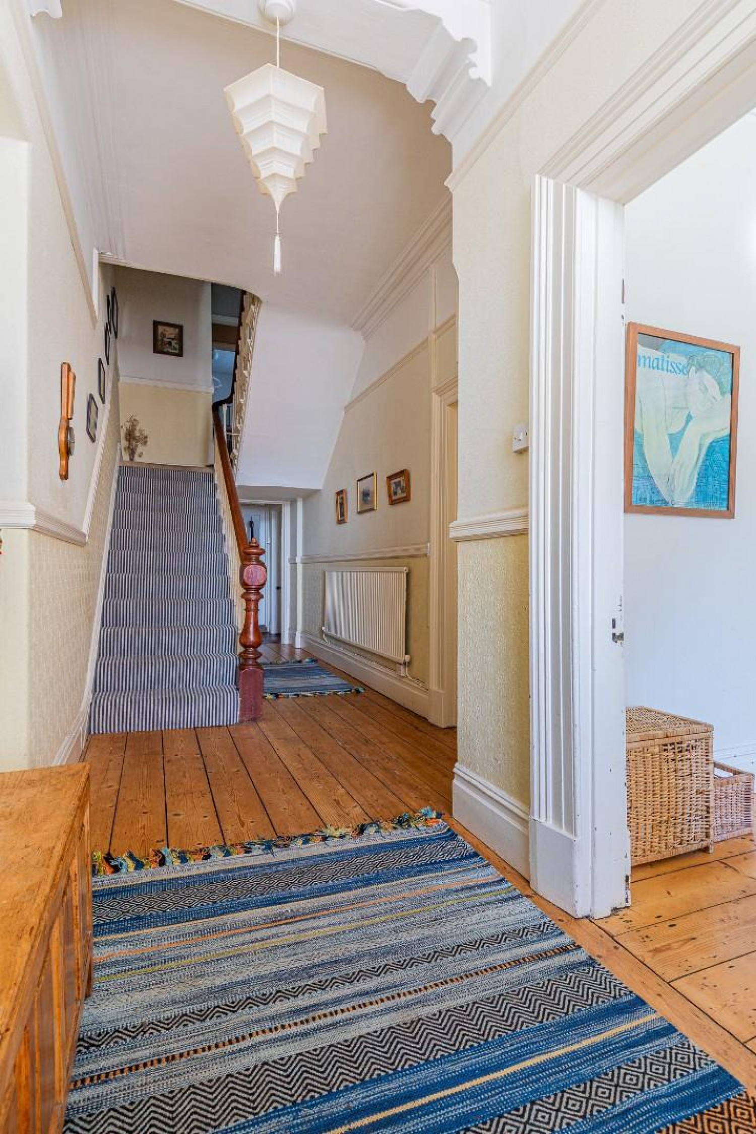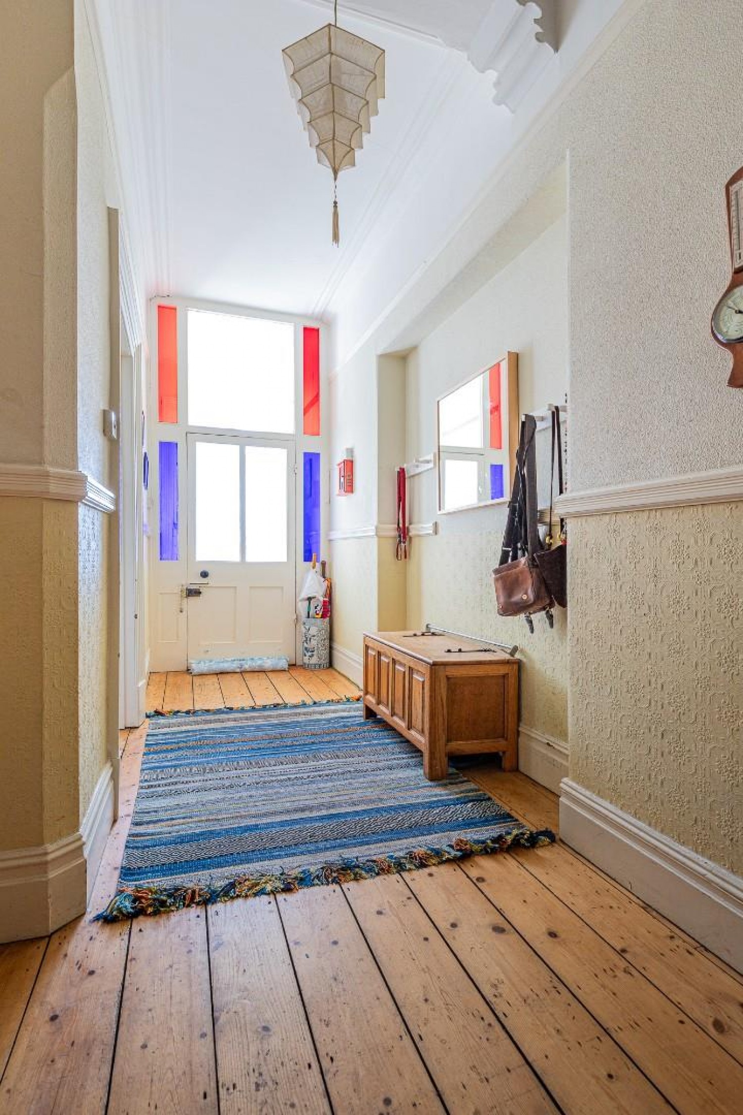 Spacious and welcoming entrance hall, stairs rise to the first floor with cupboard under plus double cloaks cupboard, original exposed floor boards.