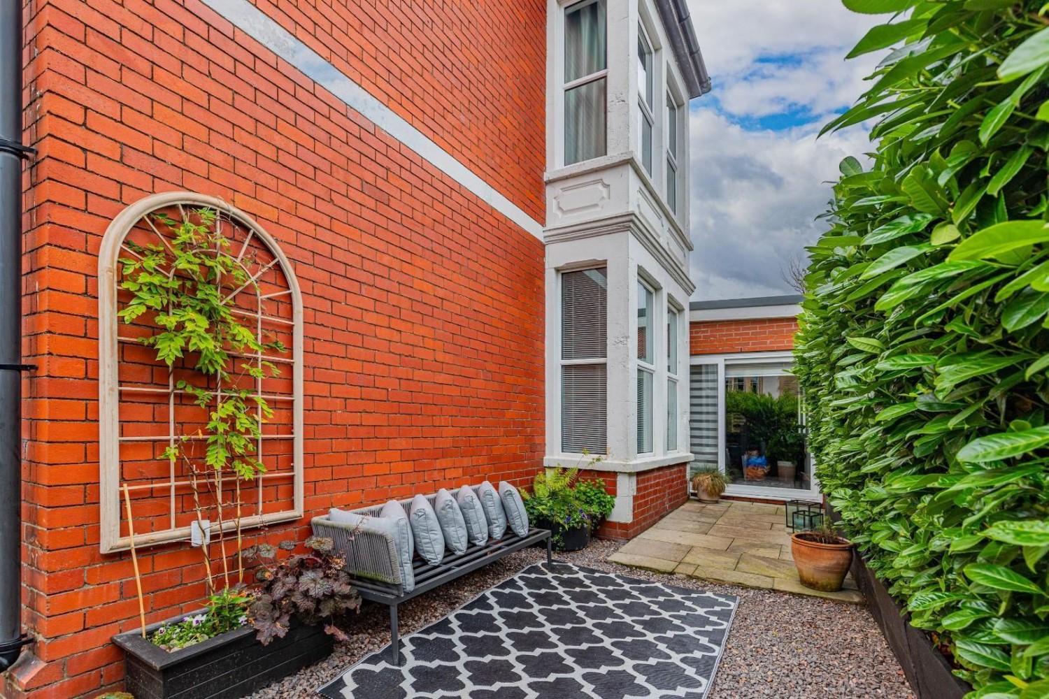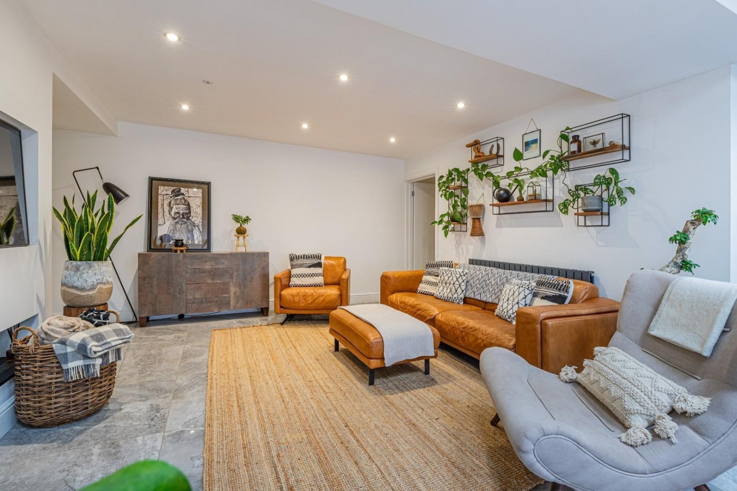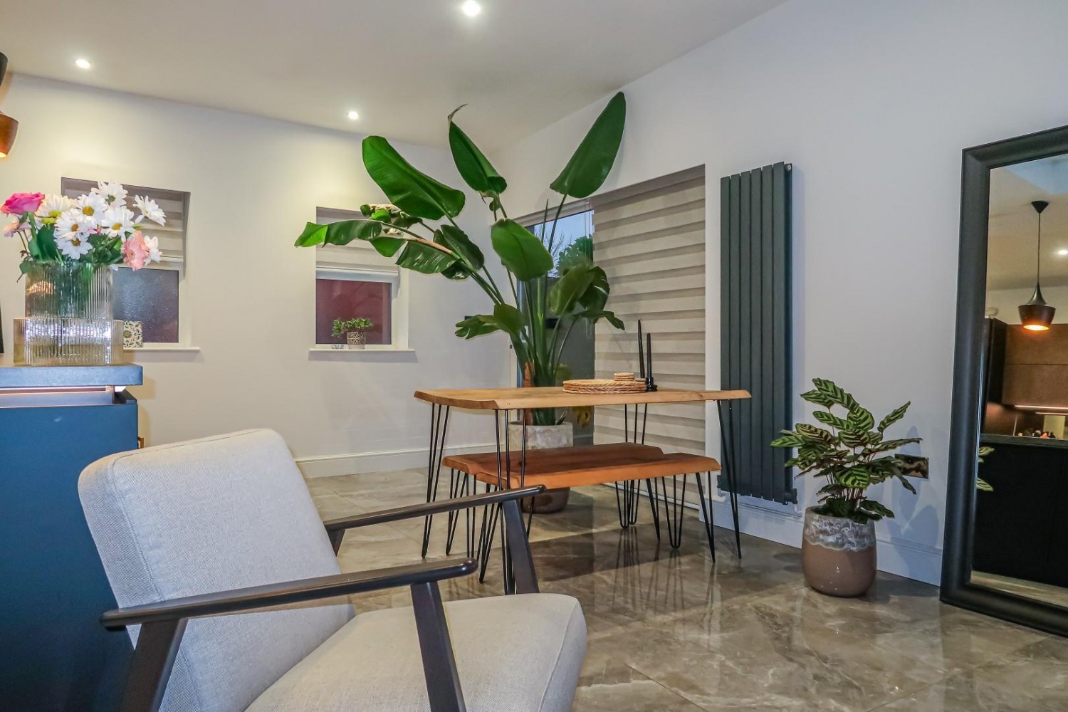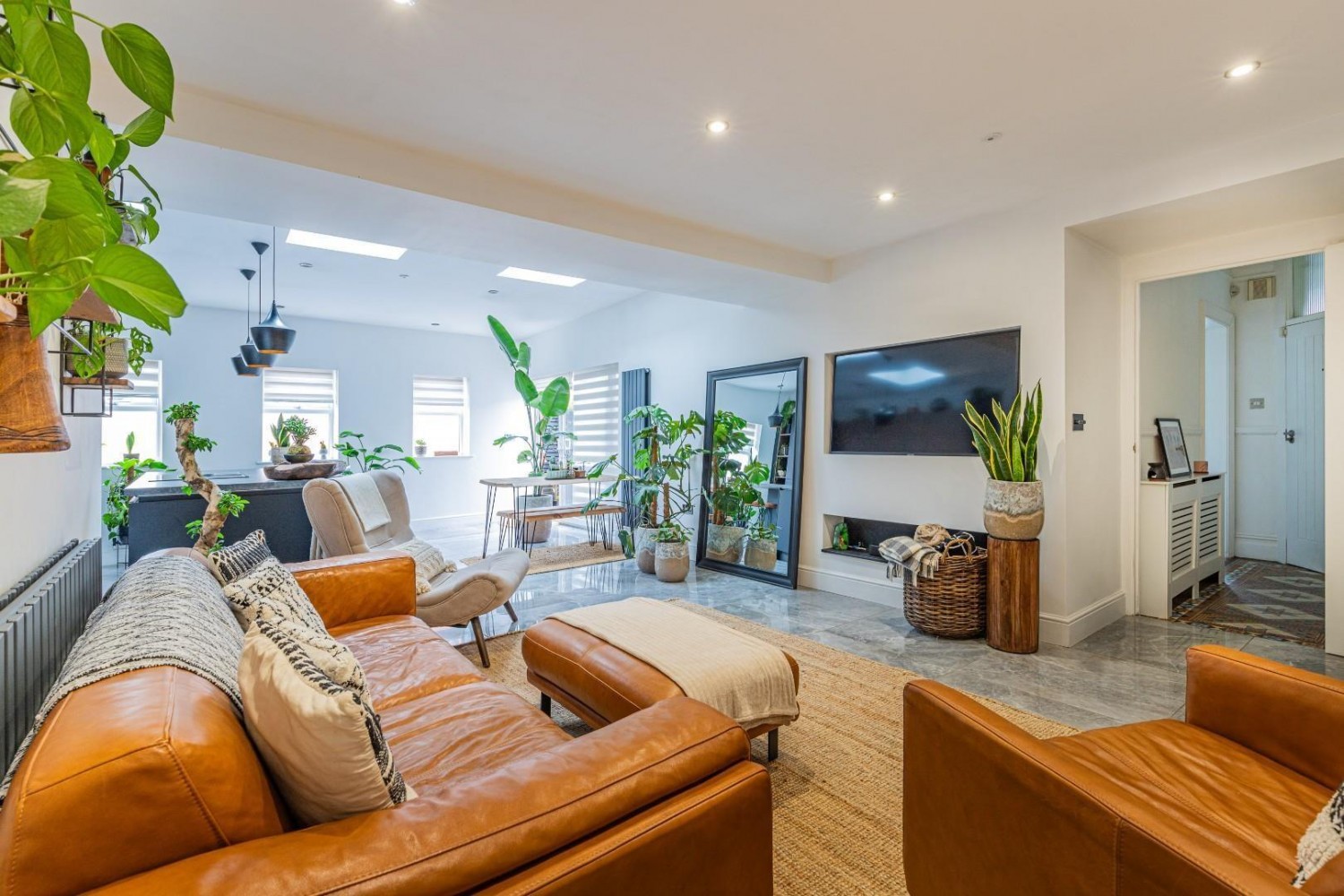 Impressively spacious main room combining the living and dining area with the kitchen, porcelain tiled flooring throughout, 3 windows to the side plus 3 roof lanterns allow plenty of light to flood in, sliding patio doors lead out to an enclosed and private garden, generous under stairs cupboard plus TV point to the living area, the bespoke German fitted kitchen benefits from an extensively fitted range of contemporary wall and base units with under mounted sink and mixer tap plus a large island unit with breakfast bar and fitted 4 ring induction hob with built in downdraft extractor fan and fitted wine chiller, also an integrated fridge & freezer plus built in oven with built in combination microwave oven, concealed gas combination boiler.