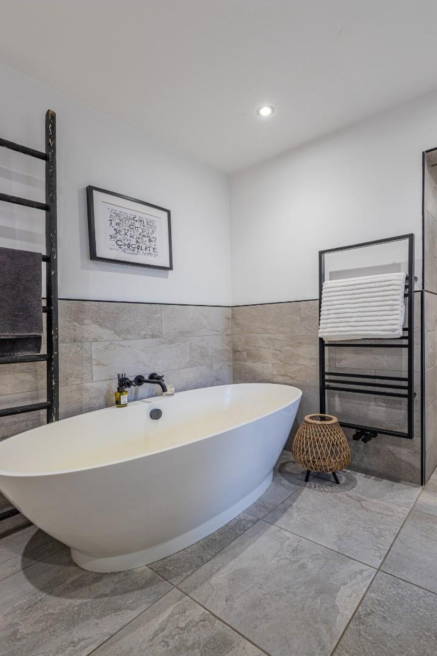 Stunningly fitted and stylishly appointed large bathroom, ceramic tiled flooring, central free standing contemporary stone bath, 'floating' wall mounted vanity wash hand basin with 2 soft close drawers, black heated towel rail, extractor fan, walk in deep tiled shower enclosure with over head shower plus attachment, to the side an area with close coupled wc - concealed cistern, heated black towel rail, window to side.