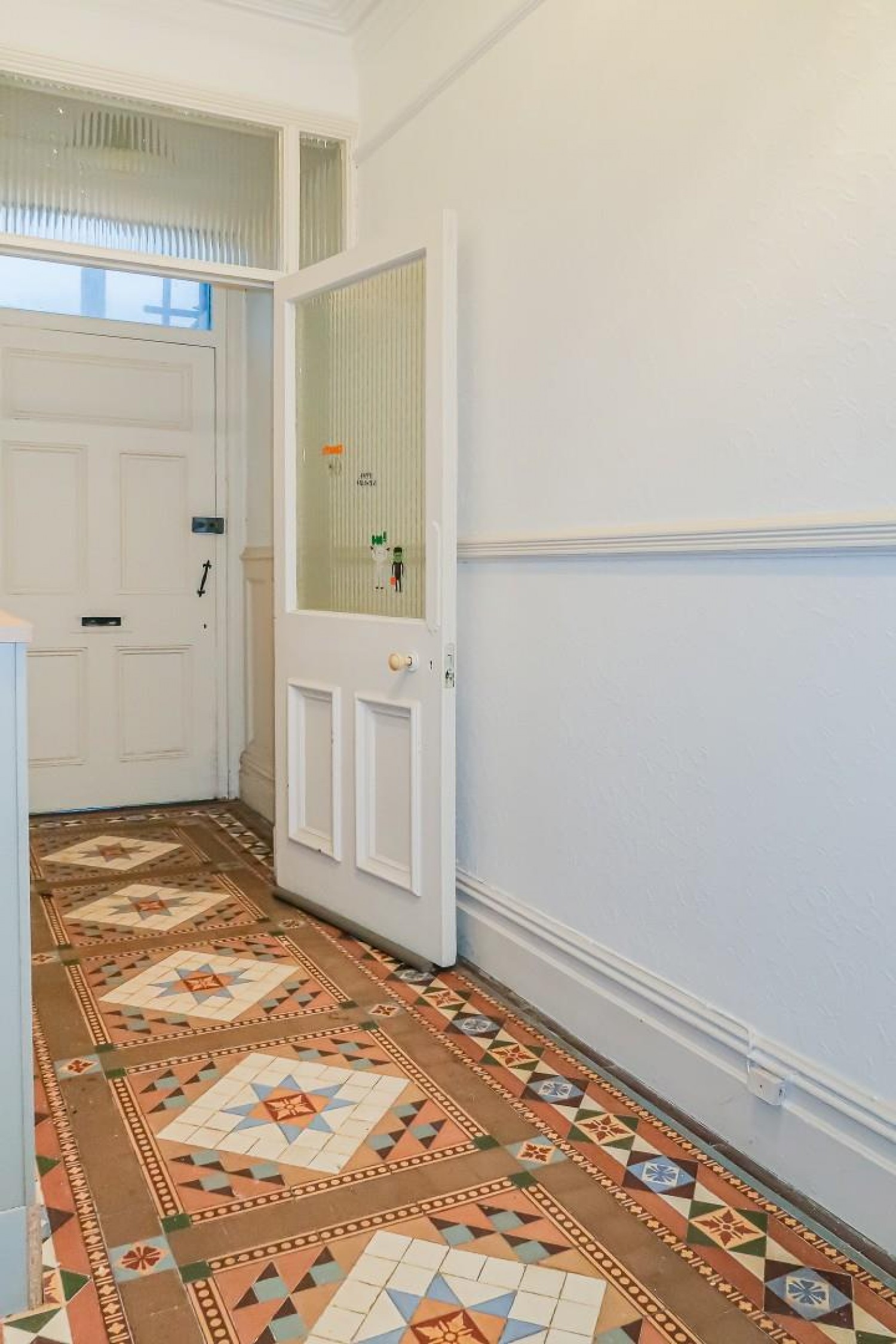 Original Terrazzo tiled flooring, access to both bedrooms and the main living room, entry-phone.