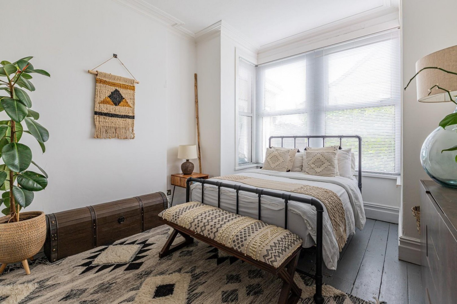 Large double bedroom, deep box window to the side, painted floorboards, original coving, large wardrobes with sliding doors to remain.
