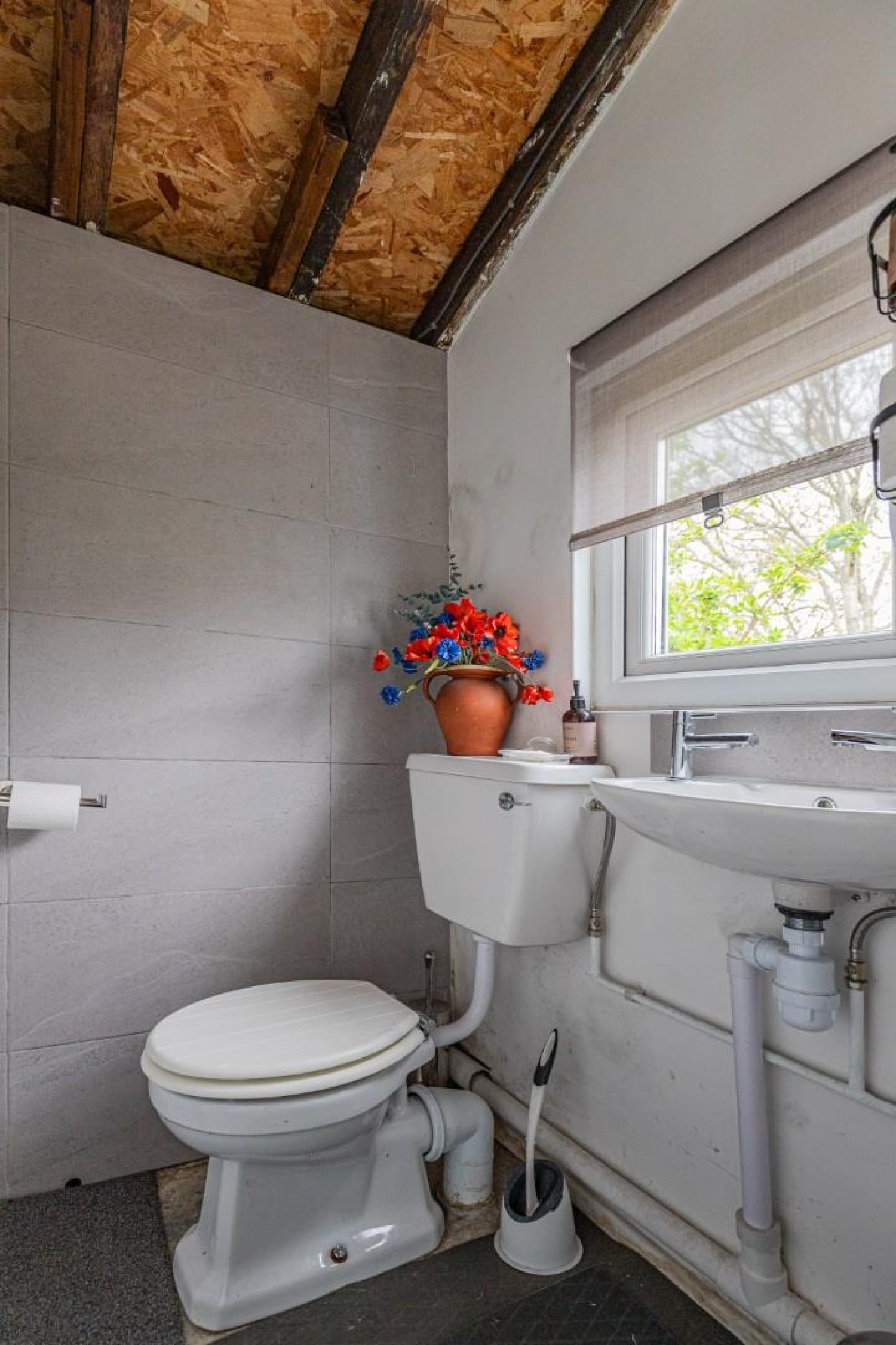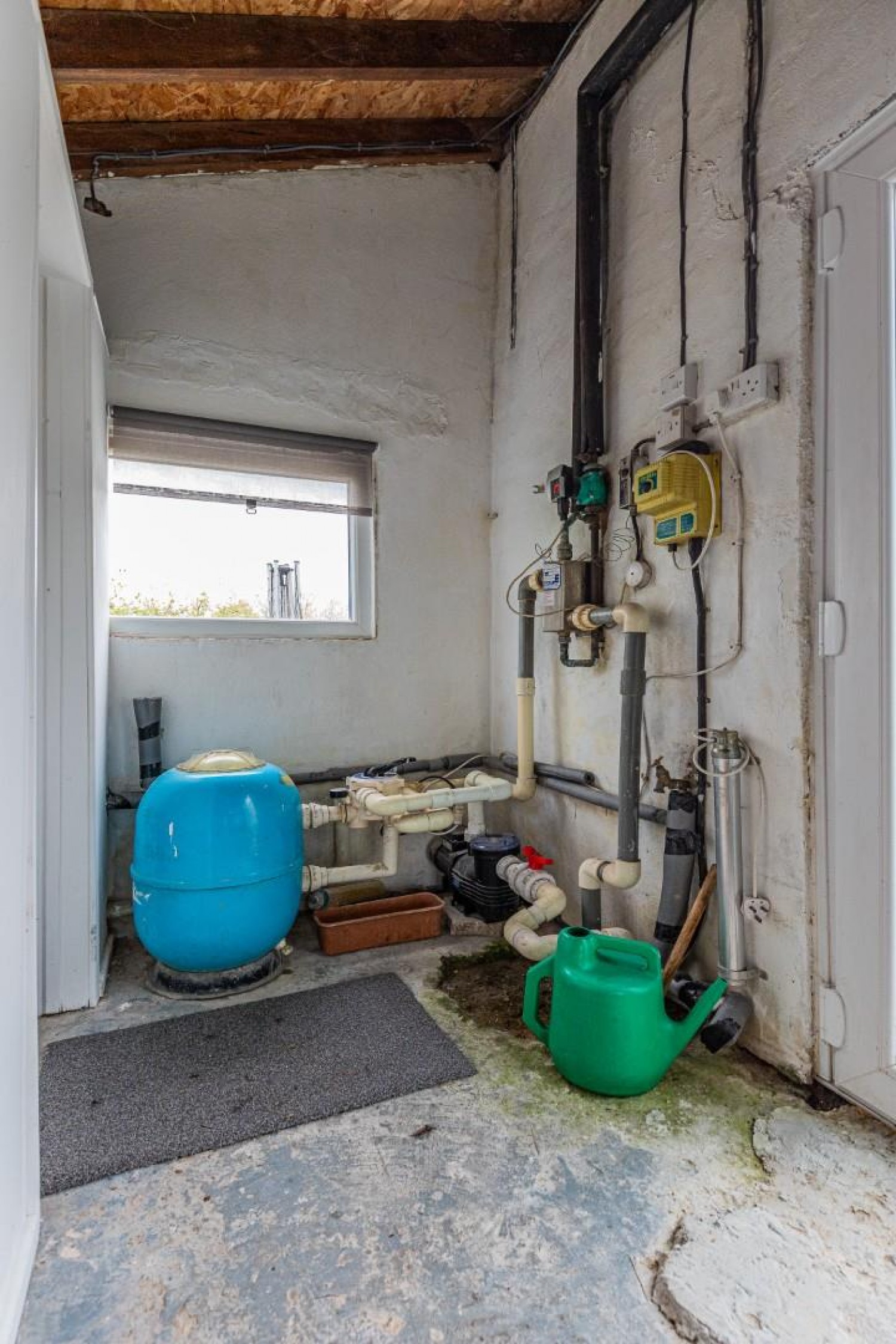 Originally the garage with front access via upvc door, light & power, window to rear, housing the pump for the pool, with a access to a cloakroom/changing room comprising wash hand basin and close coupled wc plus rear window.