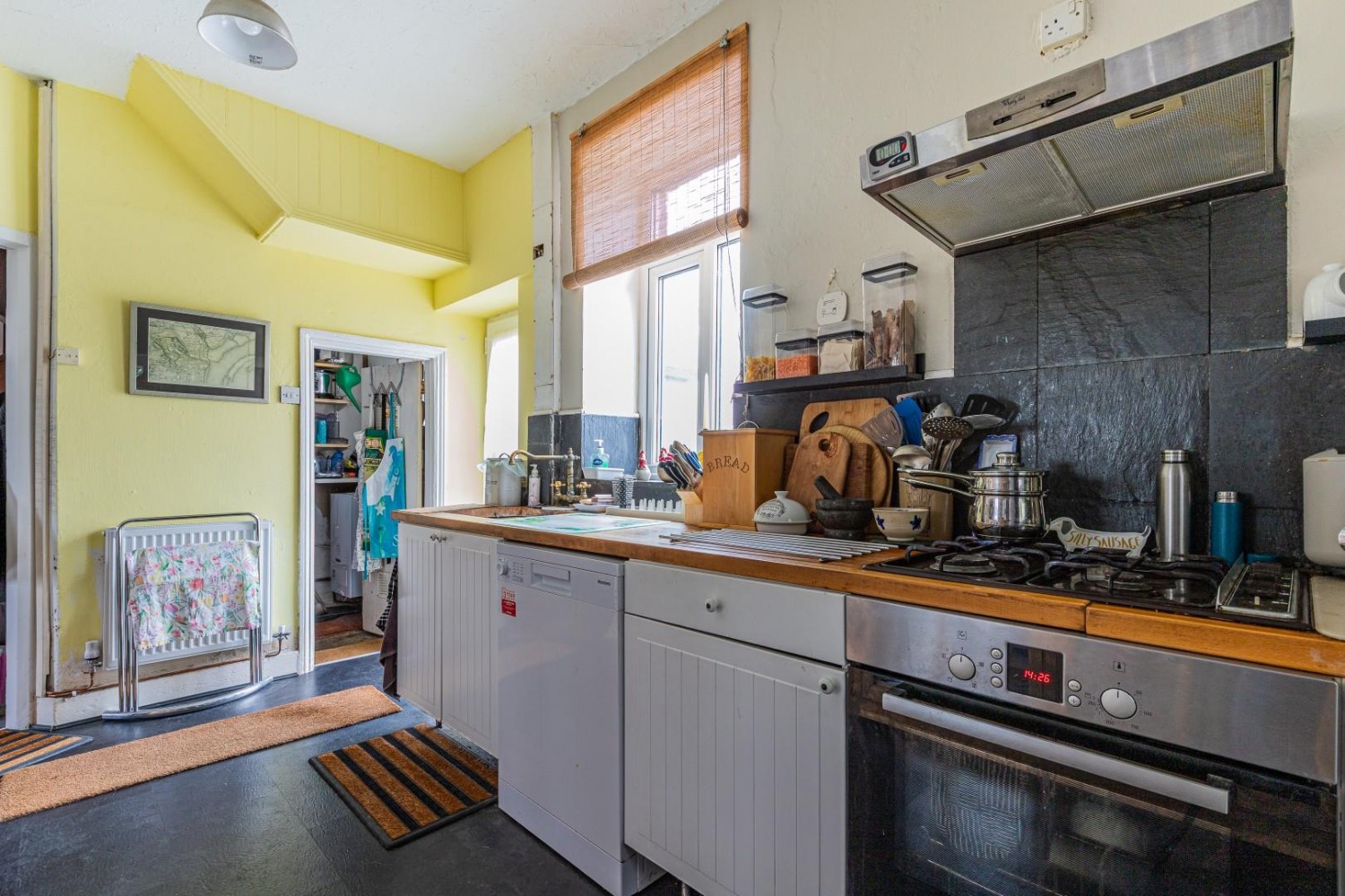Farmhouse style kitchen with fitted cream shaker style base units with solid Beech worktop and undermounted China Belfast sink with brass mixer tap, built in oven, hob & cooker hood, plumbed for dishwasher, space for fridge/freezer, window to rear plus upvc stable door to the garden, generous under stairs pantry with rear window and housing the gas combination boiler (installed 2018).
