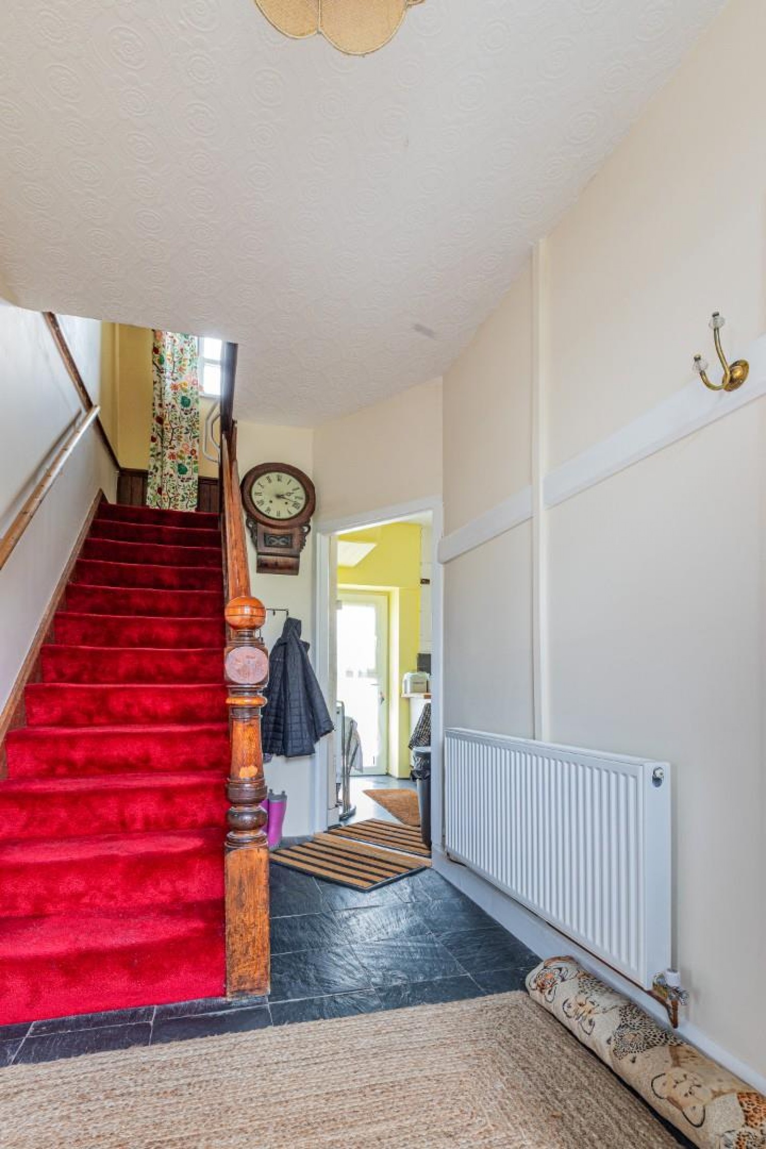 Enter via a wooden door with stained glass into a warm and welcoming entrance hall, leading to all rooms on the ground floor, stairs rise to the first floor, slate flooring.
