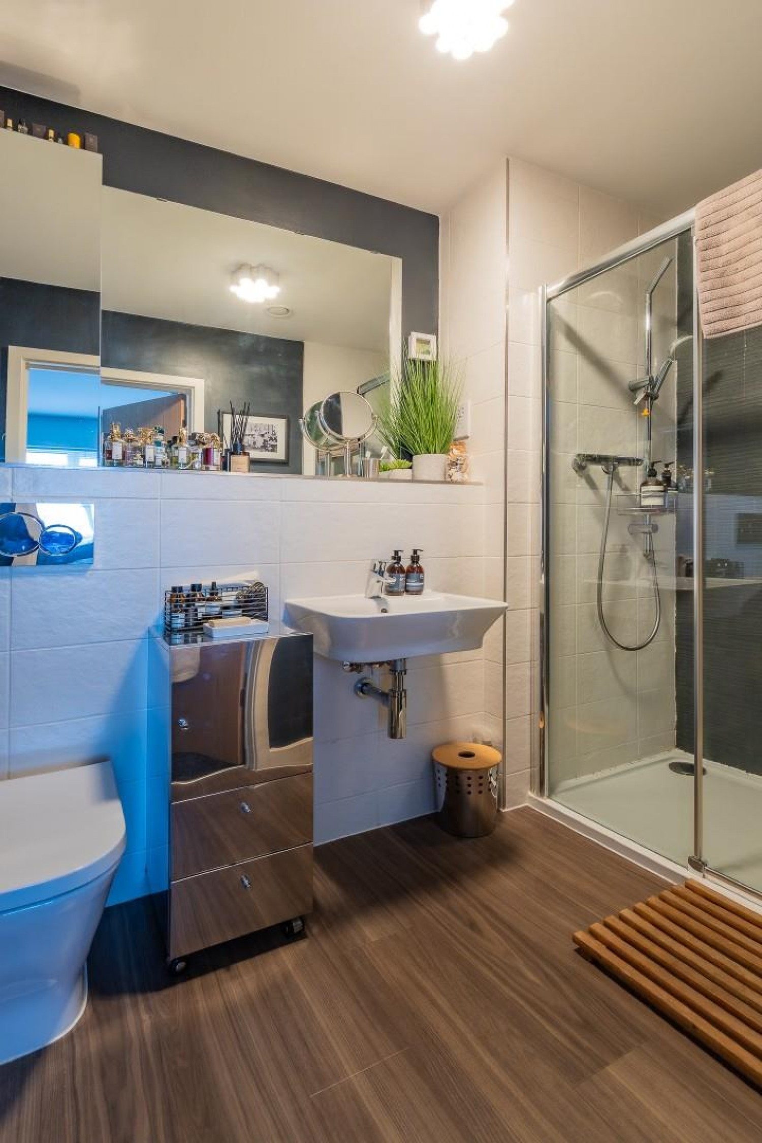 Modern white suite by Roca comprising a large tiled shower enclosure with glass doors, vanity wash hand basin and close coupled wc - concealed cistern, tiled surround and walls painted in Farrow & Ball, extractor fan, Amtico flooring.