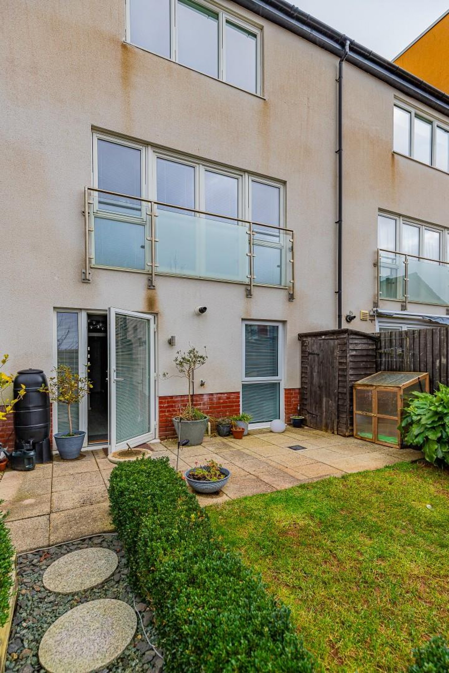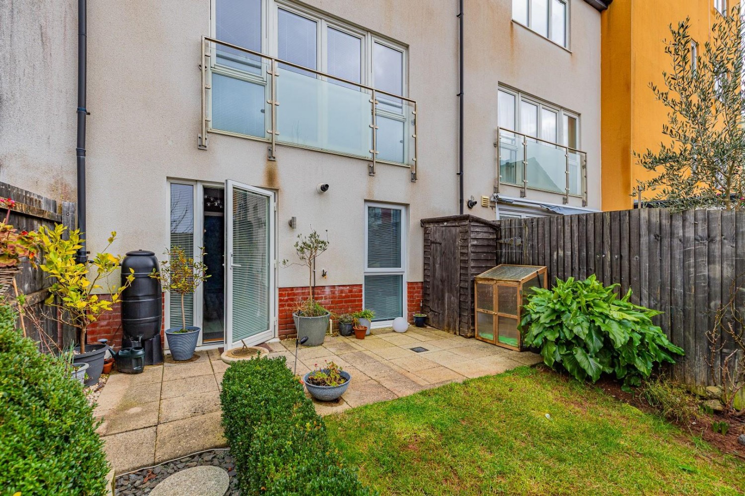 Enclosed rear Westerly facing garden - fenced. small lawn with patio area and established shrub borders, outside tap.