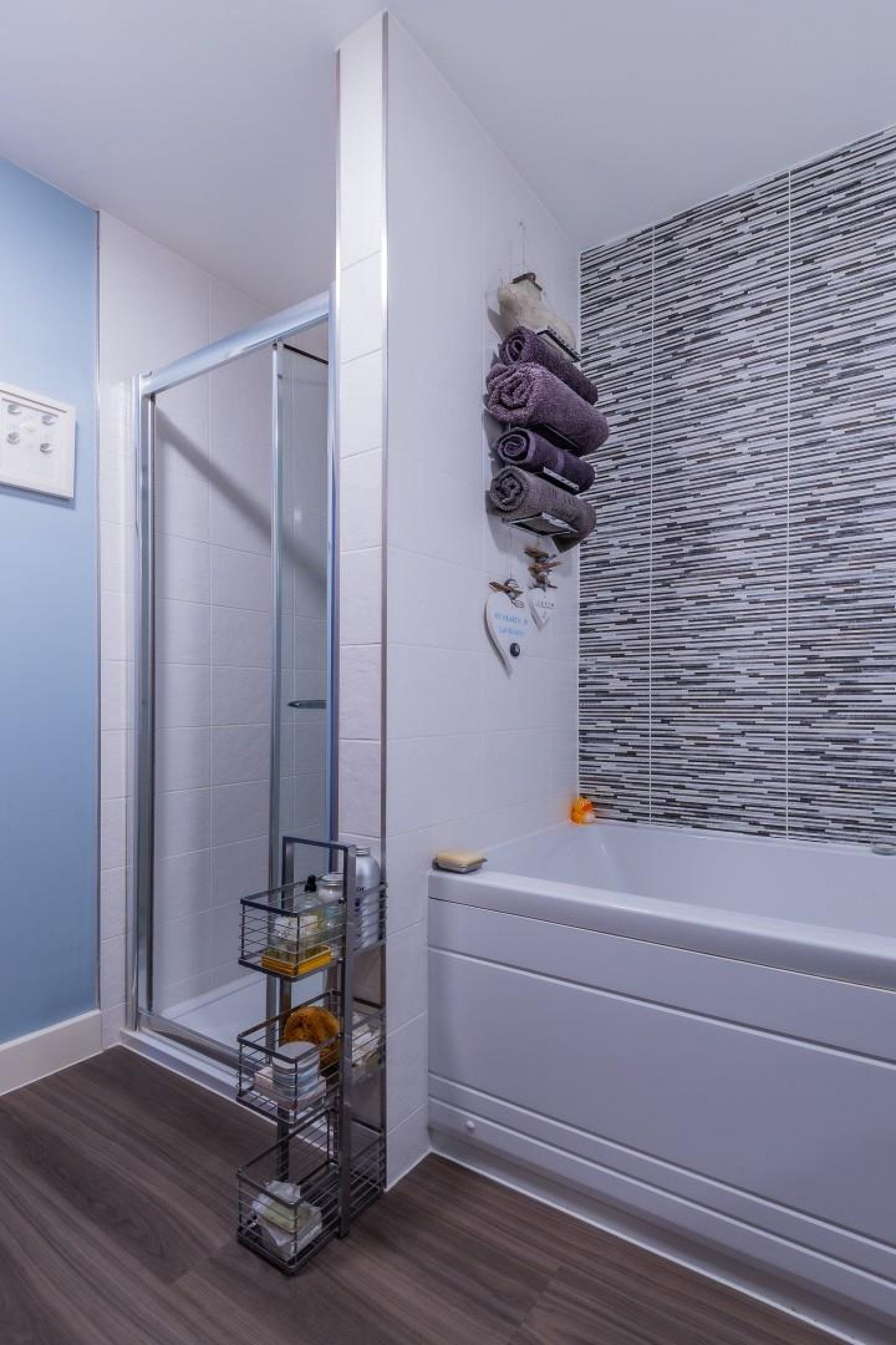 Stylishly appointed with a modern white suite by Roca, comprising a panel bath with shower over & glass screen, vanity wash hand basin, tiled shower enclosure & close coupled wc - concealed cistern, tiled surround, Amtico flooring, heated chrome towel rail, extractor fan.