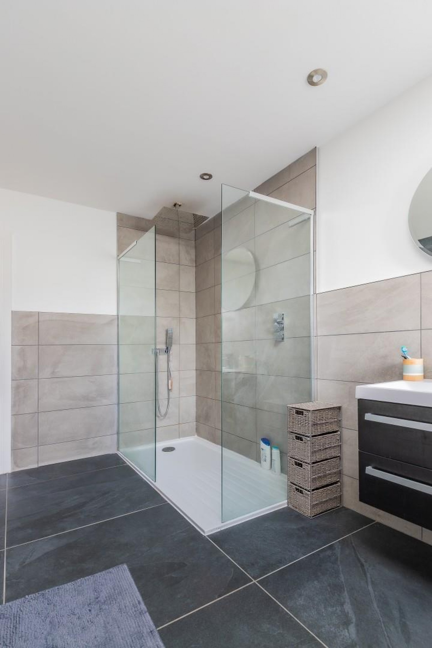 Tiled shower enclosure, floating vanity wash hand basin and close coupled wc, window to side, extractor fan, tiled surround and floor.