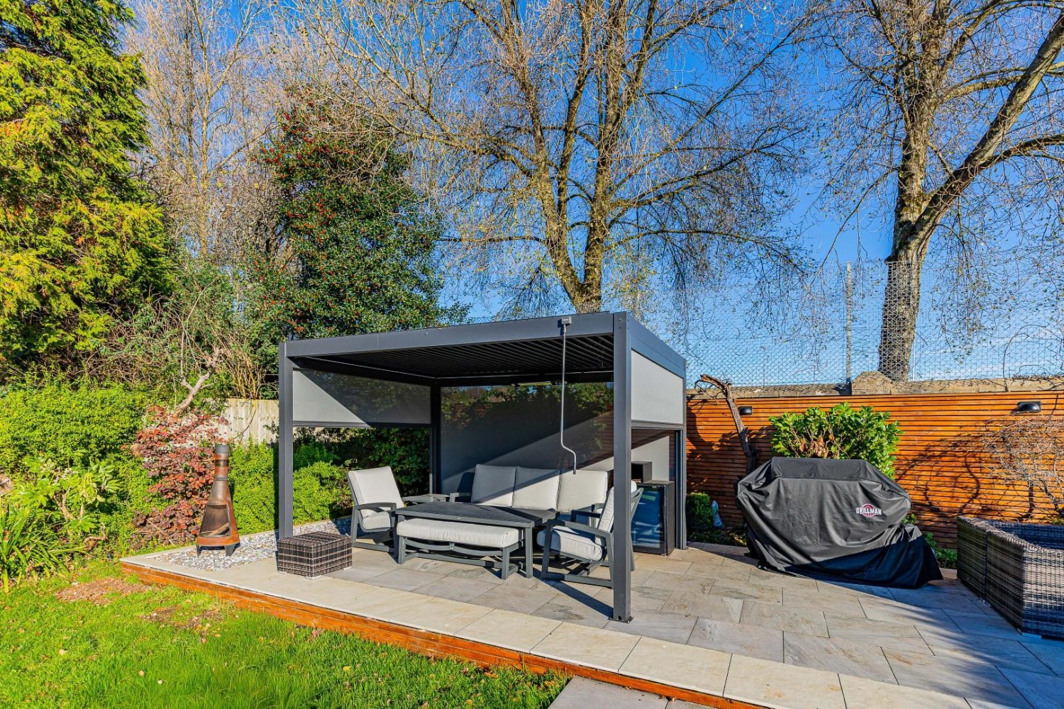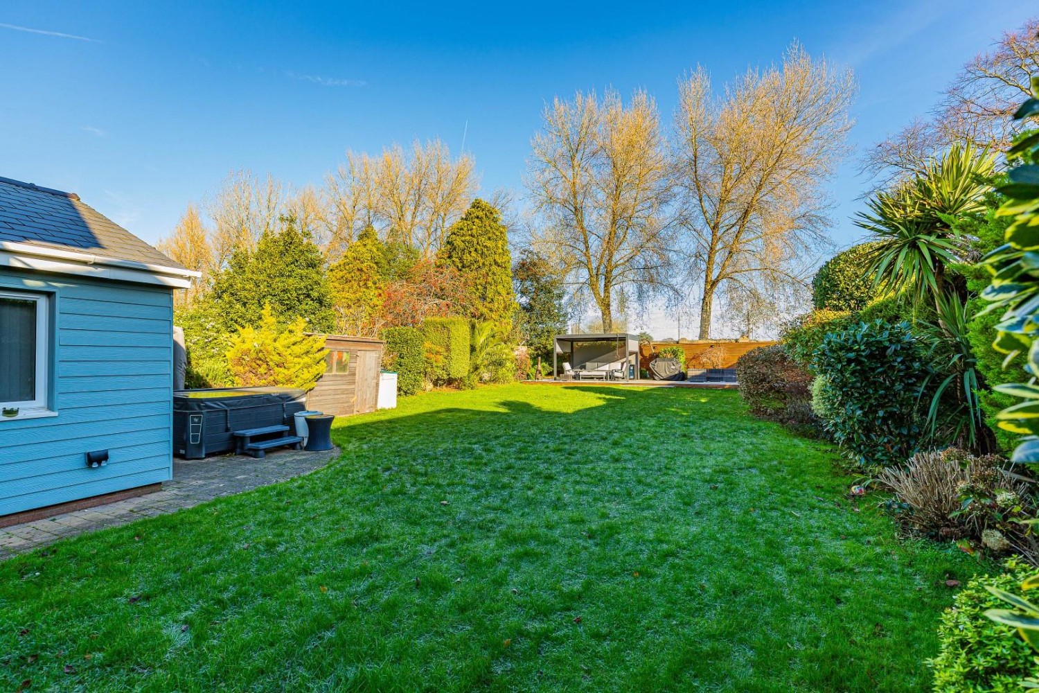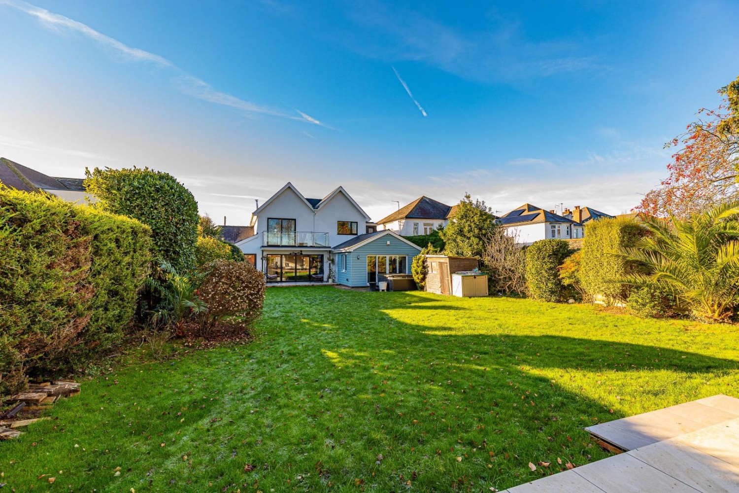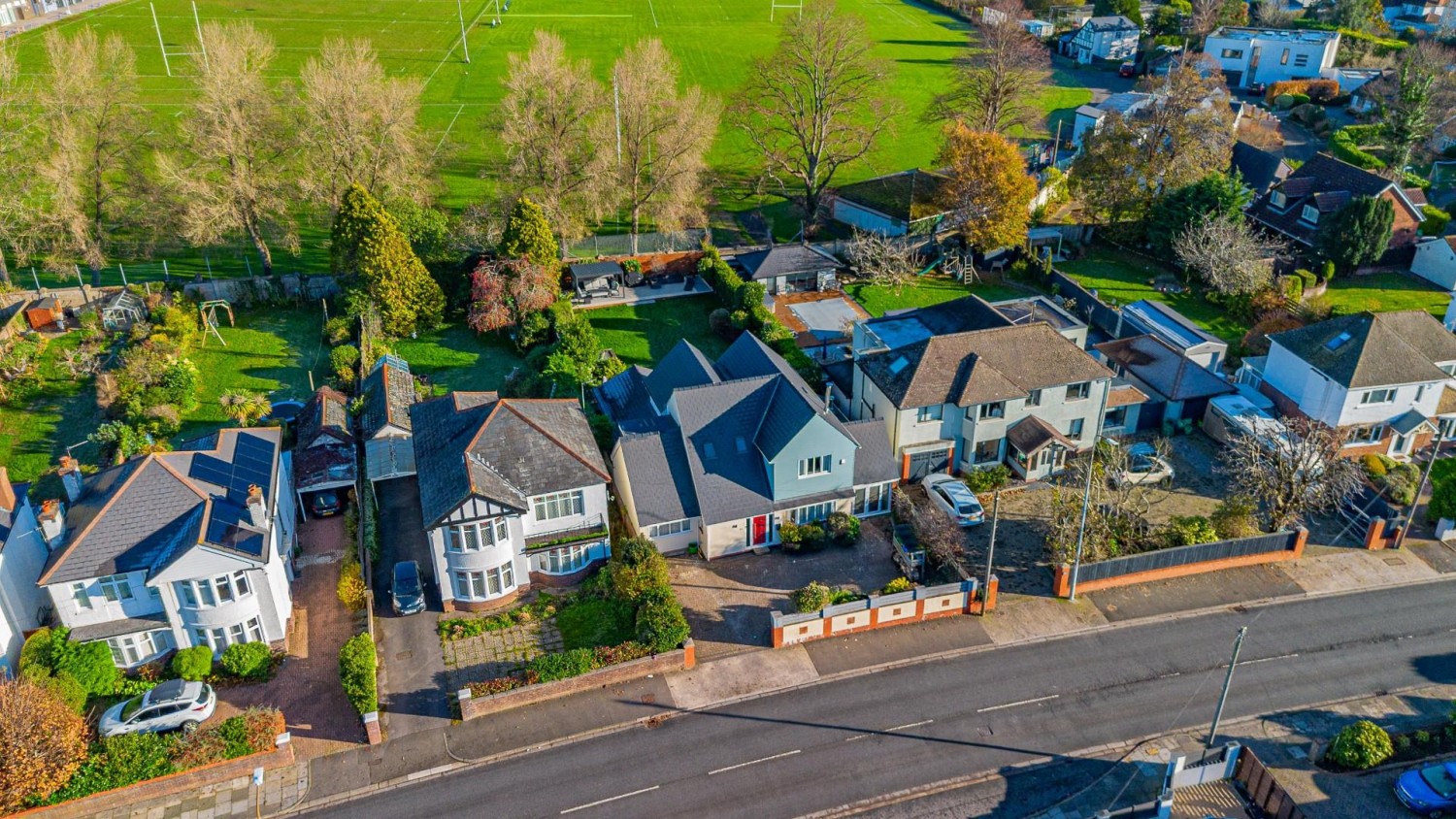Impressively large enclosed rear garden backing onto Penarth Athletic field - mainly laid to lawn, large porcelain paved patio, exterior lighting plus exterior double power socket, outside tap plus fitted electric outdoor heater, to either side a boundary wall plus mature shrub borders, to the far end a second paved terrace with a fitted Arbour with slatted roof, ample power sockets plus exterior lighting.