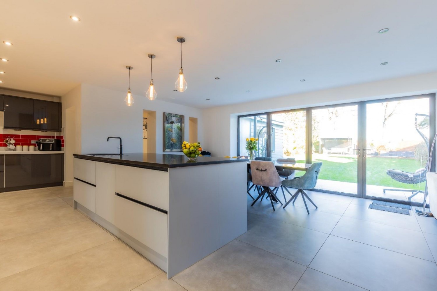 Superb extension now providing the heart of the the home, combining the kitchen with dining open to a family area, porcelain tiled flooring with under floor heating, kitchen fitted by Magnet with an extensive range of contemporary wall and base units with solid Quartz worktops, includes a large Island with breakfast bar and an inset under mounted sink with mixer tap including a Quooker instant hot water tap plus an integrated dishwasher, further appliances include a built in double oven with ceramic hob & cooker hood, features include soft close doors and drawers plus under lighting, space for an American fridge/freezer.