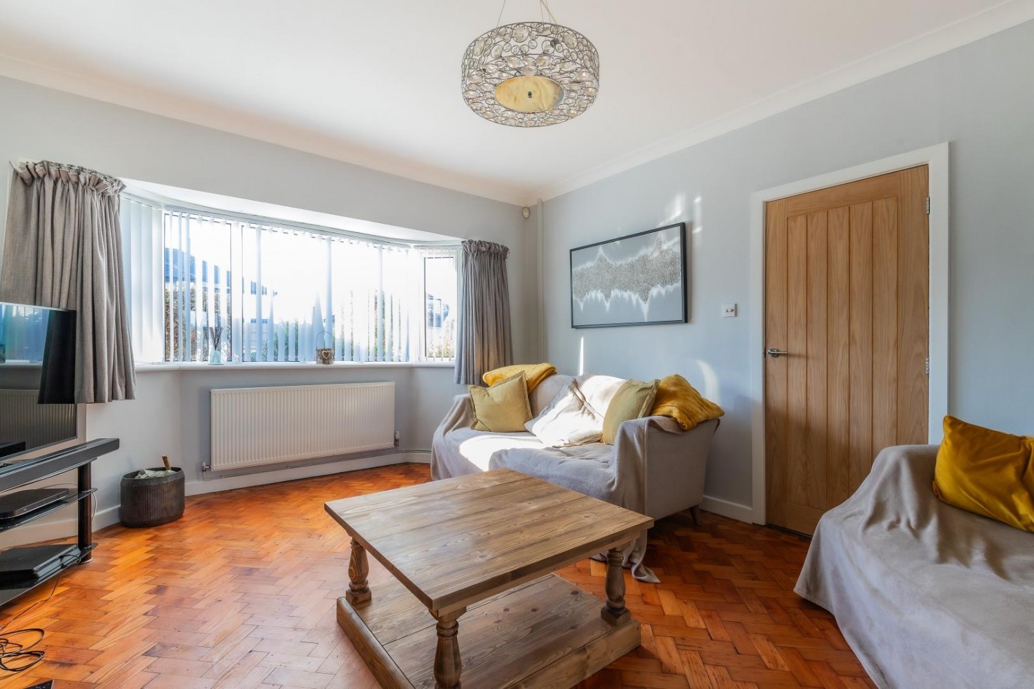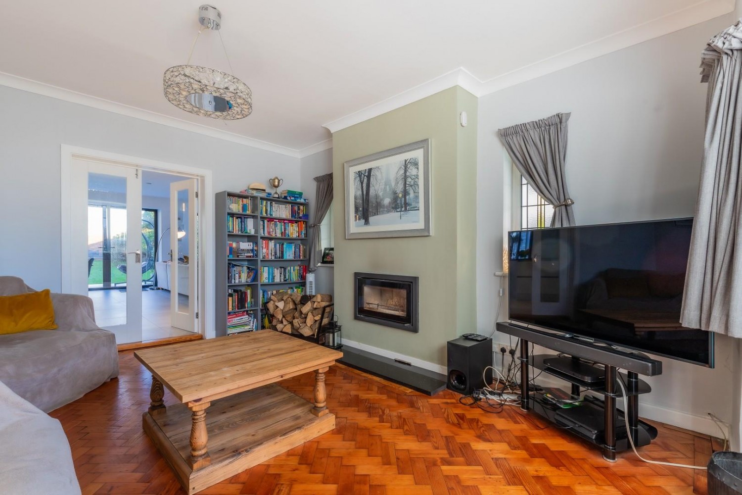 Spacious main living room, bay window to front with 2 side windows, within the chimney breast an inset wood burning stove, polished Herringbone oak block flooring, TV point.