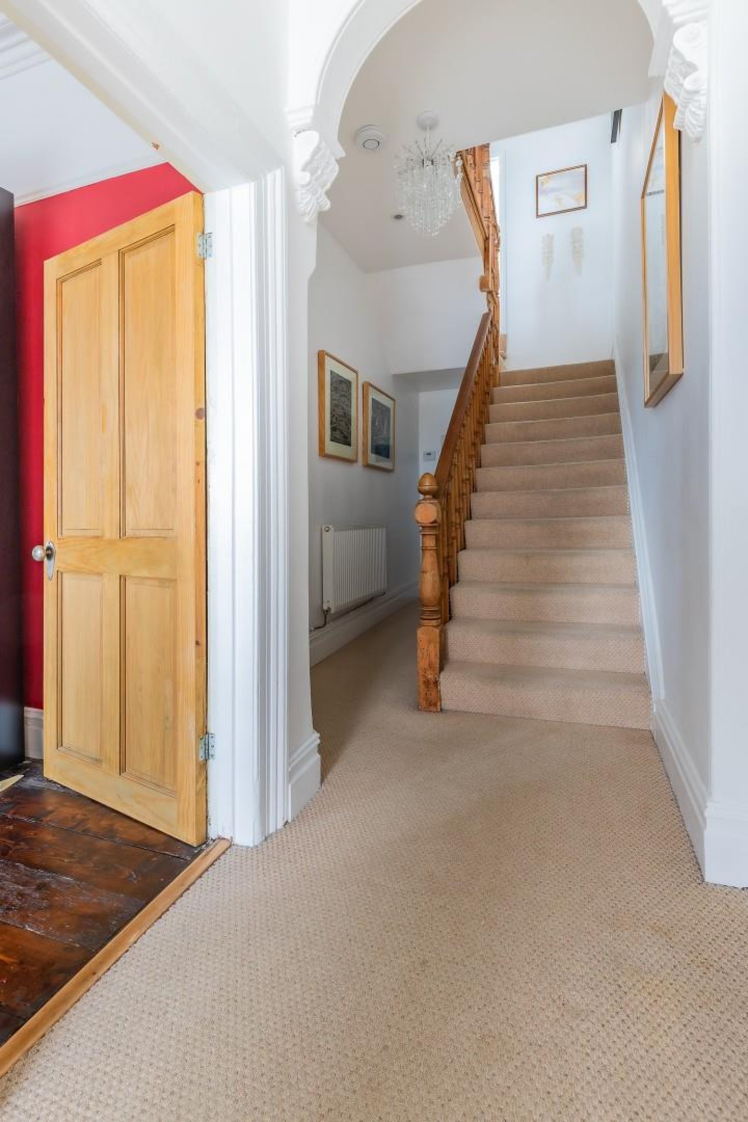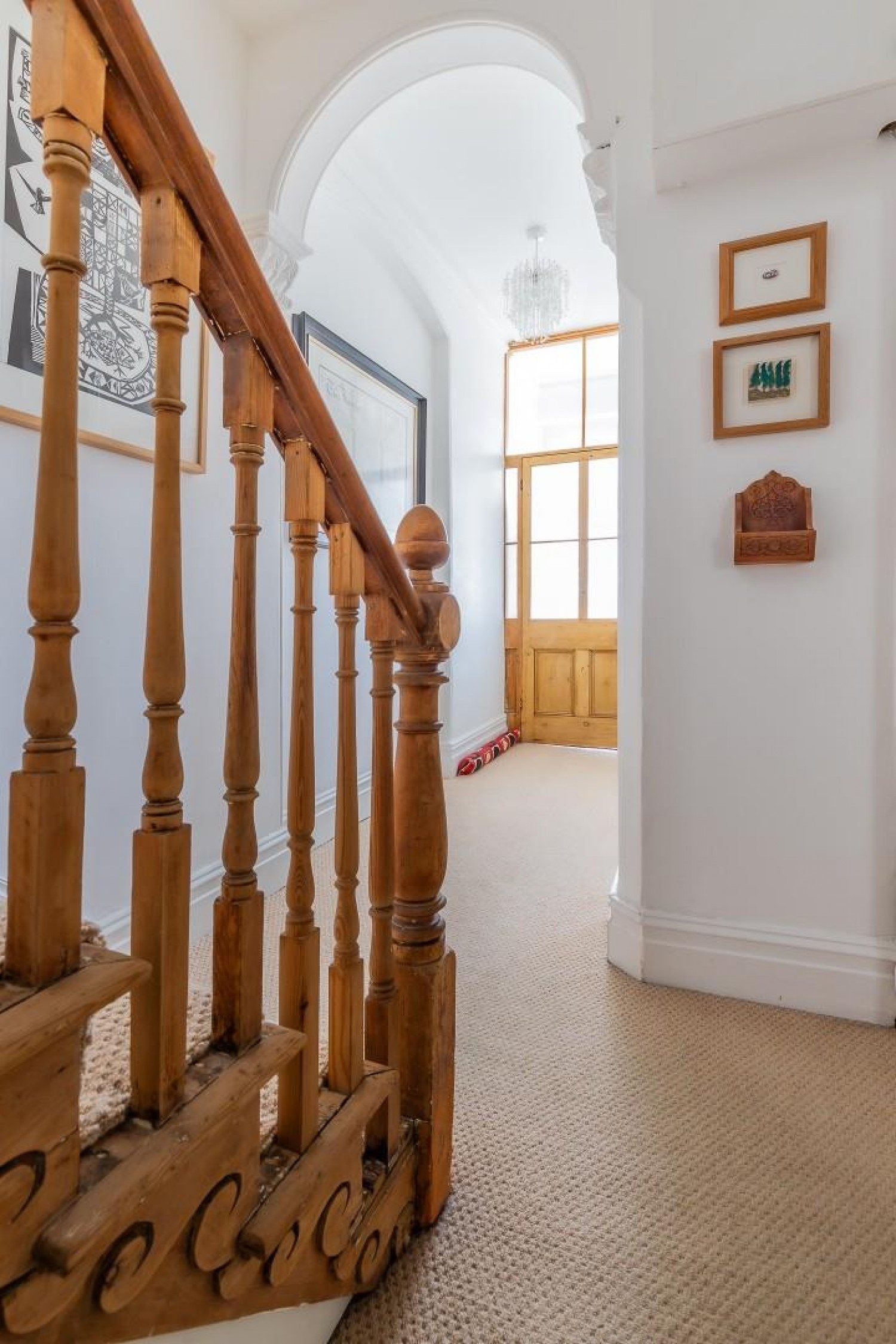 Enter via an original pine door with retro glazing, access to all bedrooms and bathroom, stairs rise to the first floor with 2 cupboards under, coving.