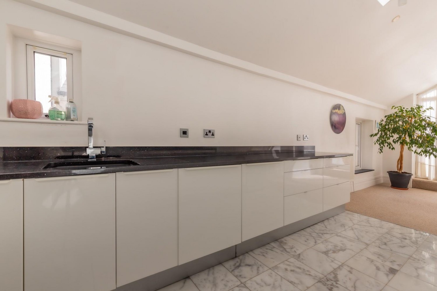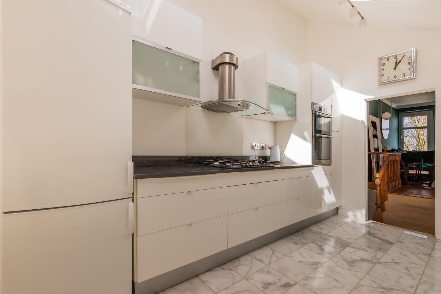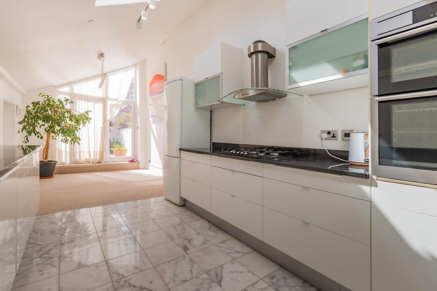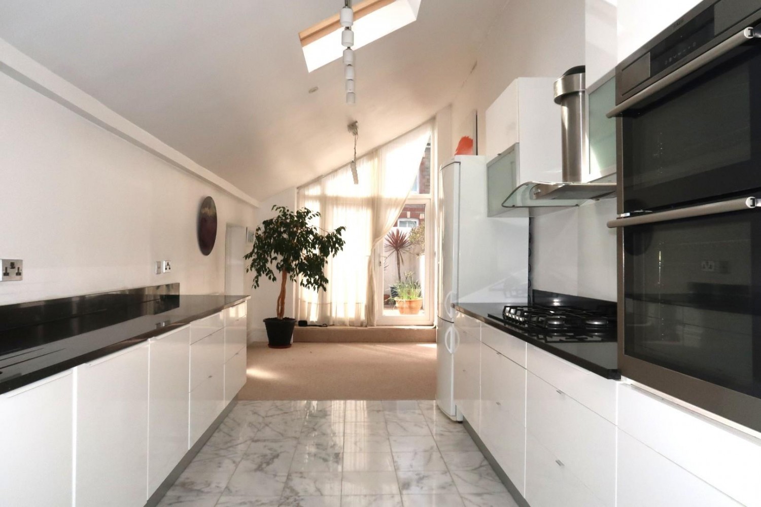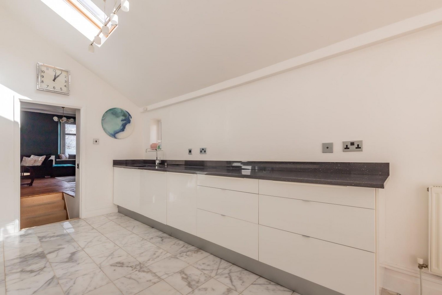Superb room with part vaulted ceiling and inset two velux roof windows, 2 windows to side and at the rear - wide French doors with side glazed panel overlook and lead into the garden, fitted range of contemporary white base units with solid granite worktop and inset under mounted composite sink with mixer tap, integrated dishwasher plus washing machine with built in double oven, 5 ring gas hob & hood, space for fridge/freezer, marble tiled floor and fitted carpet to the dining area.